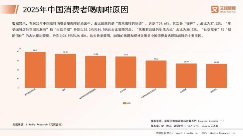 这种趋势可以通过多家研报的数据交叉验证:艾媒咨询发布的《2025年中国咖啡市场发展状况与消费行为调查数据》显示,中国消费者喝咖啡的场景中,在日常学习或工作时喝咖啡的消费者占比最高,达到47.89%,休闲放松时喝咖啡的消费者占比紧随其后,达到45.02%。咖啡消费原因中39.69%的样本选择是“喜欢咖啡的味道”,排名第二的原因是“提神”,达到37.52%。从中国消费者月均咖啡消费额来看,区间101-150元和区间51-100元的占比最多,两个合计占到了近八成,整体上看得出来消费者在咖啡消费金额上以中低价格为主。