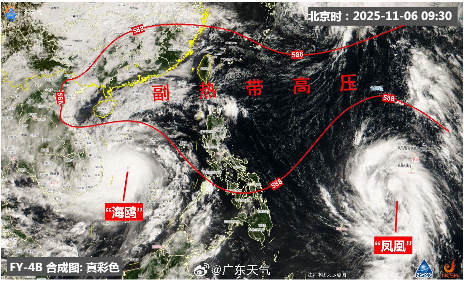 据@广东天气 消息,今天(11月6日),从卫星云图可见,海上有两个台风活动,分别为今年第25号台风“海鸥”和第26号台风“凤凰”。