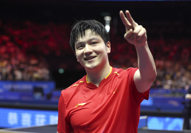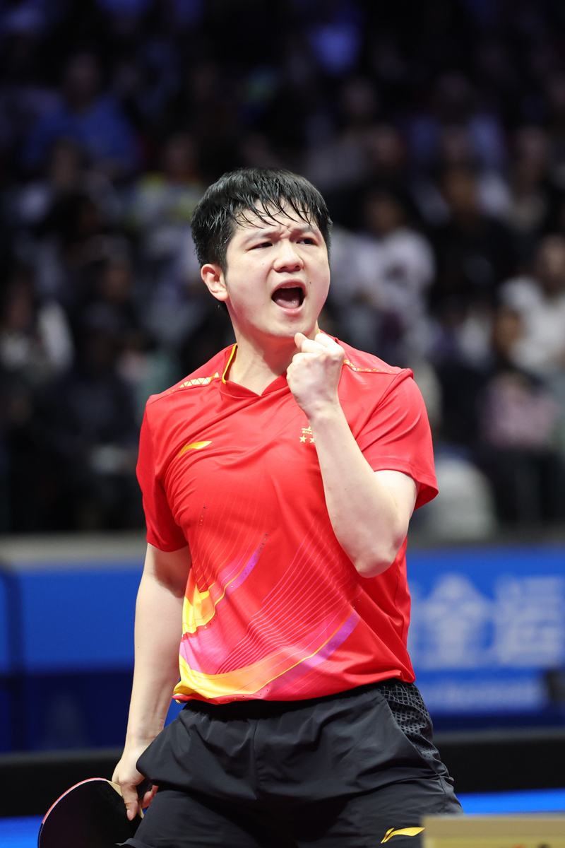2025年11月16日,上海队选手樊振东庆祝获胜。当日,在澳门举行的第十五届全国运动会乒乓球男子单打金牌赛中,上海队选手樊振东4比1胜海南队选手林诗栋,夺得冠军。 新华社记者 陈斌 摄