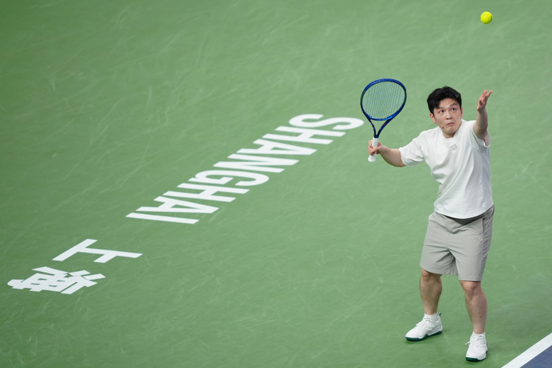 2024年10月11日,乒乓球运动员樊振东在网球双打表演赛中。新华社记者 白雪飞 摄