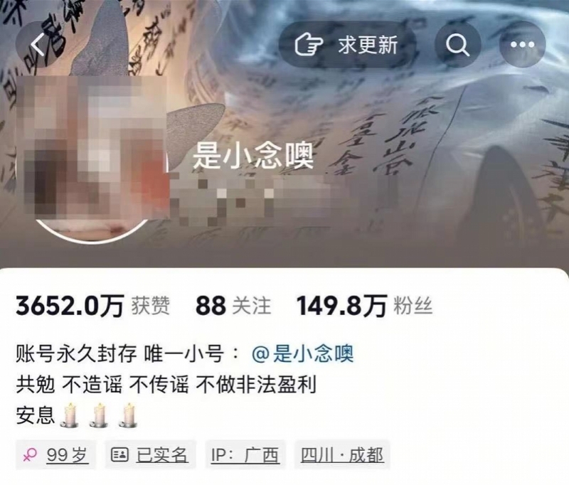 涉事博主。南都此前报道,5月11日凌晨,百万粉丝网红“是小念噢”发布一则消息称,该账号博主真名叫孙某,“已于5月10日23点,在成都自杀去世,其账号已交由亲友管理。对于自杀细节,请大家不信谣、不传谣……”随后,疑似孙某的亲友在视频评论区称:“她是被逼死的,遗书以及聊天记录里,对方想勒索130万元,我们很是心痛……”