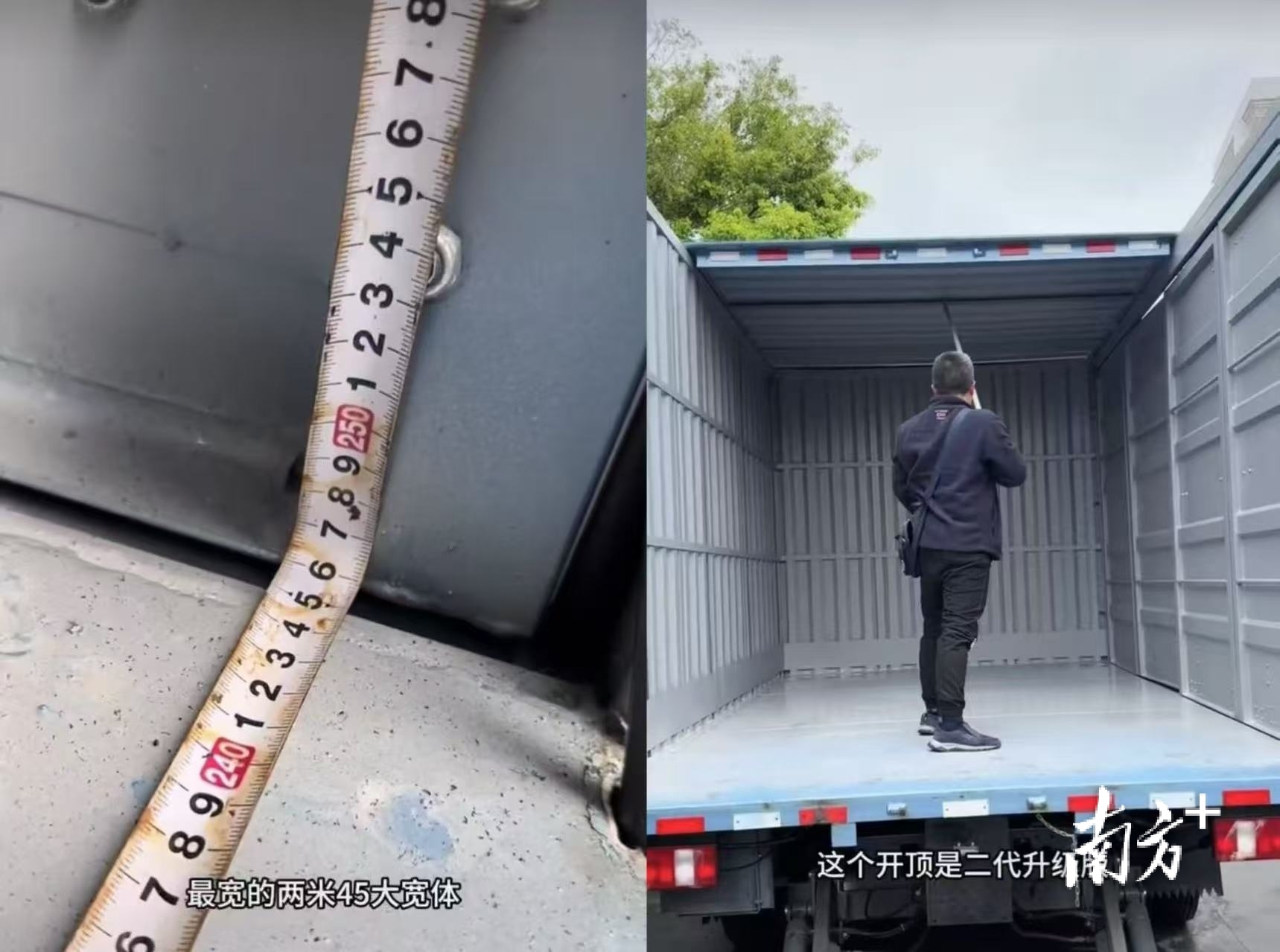 阿涛向记者报料,其租赁的货车是欧陆(深圳)新能源科技有限公司(下称“欧陆新能源”)出租的。该公司为货车司机们专门“开发”的“超宽”型车,正常2.1米宽的货厢会加宽至2.4米左右。这些货车经改装后,车顶、侧门还可以打开,装货卸货更方便也能拉更多货物,但极易超载且盲区增大也降低了安全性。