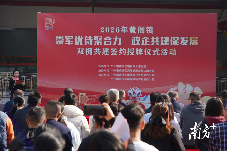 1月15日,广州市南沙区黄阁镇举行拥军商企签约授牌仪式,98家来自餐饮、零售、生活服务等领域的企业集中签约,加入社会化拥军体系,为现役军人、退役军人及优抚对象提供多项专属优待。