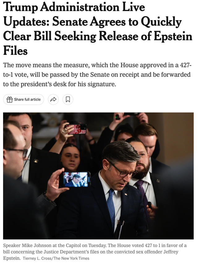 《纽约时报》报道,众议院以近乎全票通过《爱泼斯坦档案透明法案》,仅数小时后,参议院一致同意,该法案送达参议院即获通过。