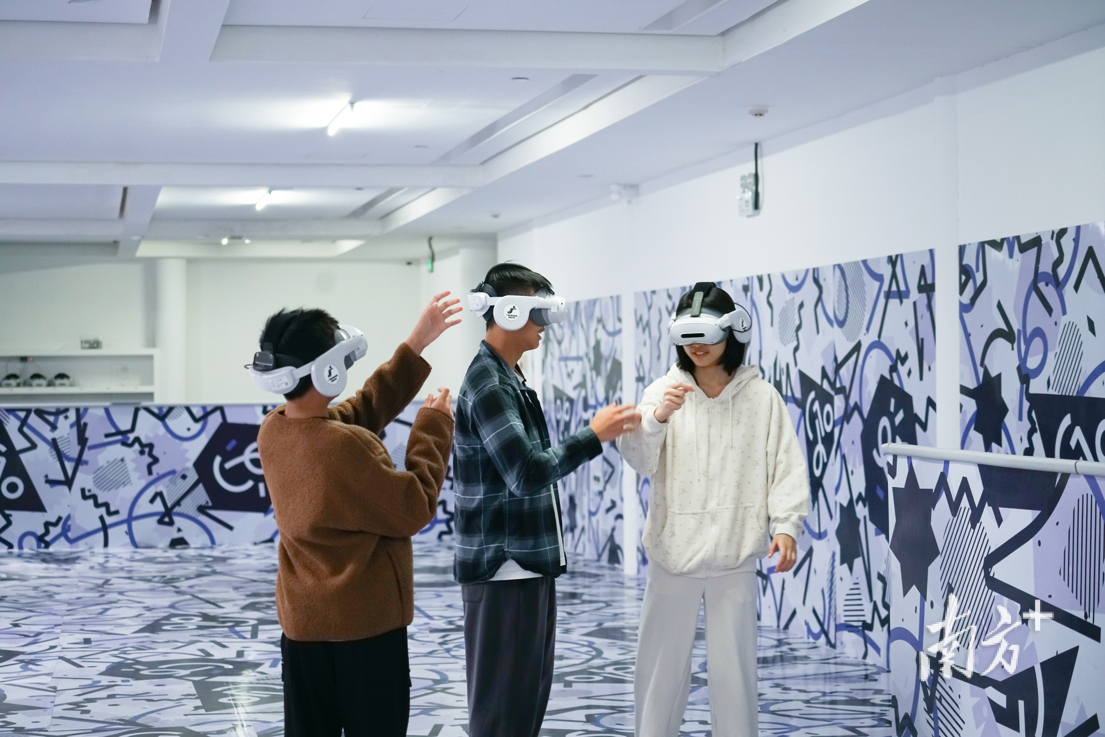 广州市文化馆内市民戴上VR眼镜参与体验。