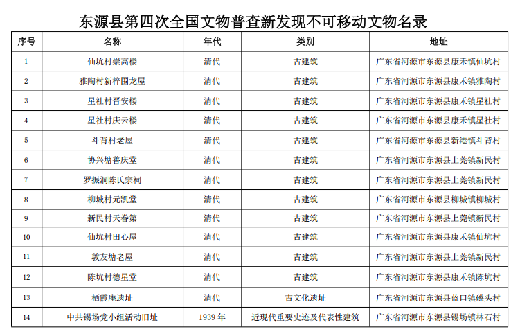 记者获悉,近日在第四次全国文物普查工作中,河源市东源县文物普查队伍经过田野调查、走访勘测与专家论证,取得了阶段性重要成果,核定公布新发现不可移动文物共计41处,标志着该县历史文化遗产图谱得到有效扩充,对传承地方文脉、深化文旅融合具有重要意义。