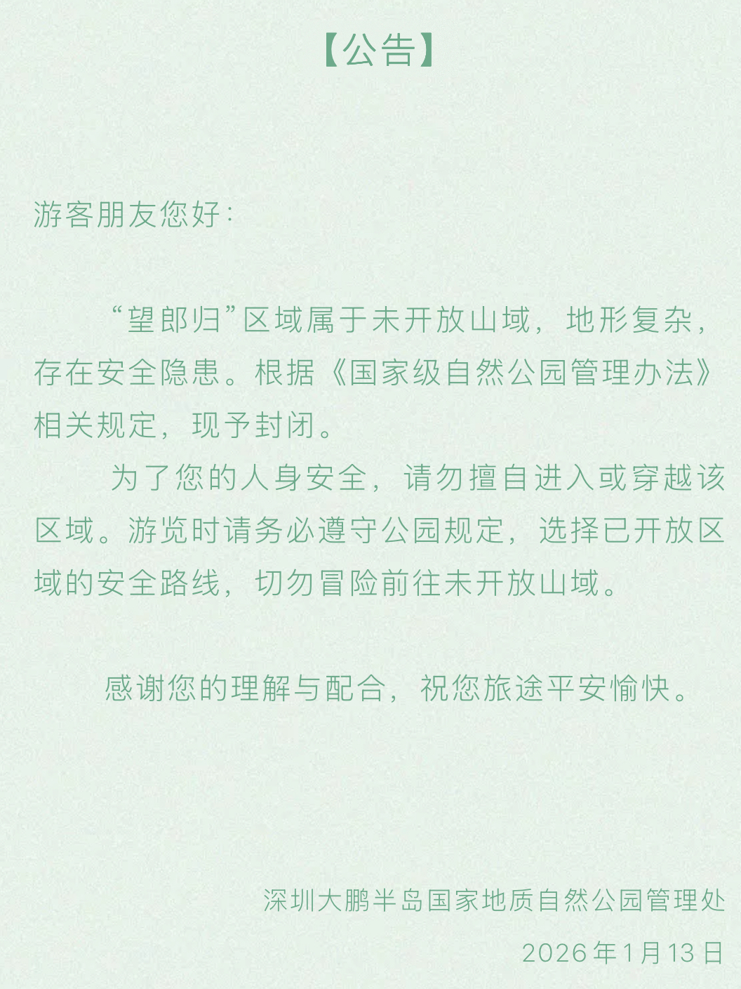 1月13日,深圳大鹏半岛国家地质自然公园管理处发布公告称,“望郎归”片区属于未开放山域,地形复杂,存在安全隐患。根据《国家级自然公园管理办法》相关规定,现予封闭。“为了您的人身安全,请勿擅自进入或穿越该区域。游览时请务必遵守公园规定,选择已开放的安全路线,切勿冒险前往未开发放山域。”