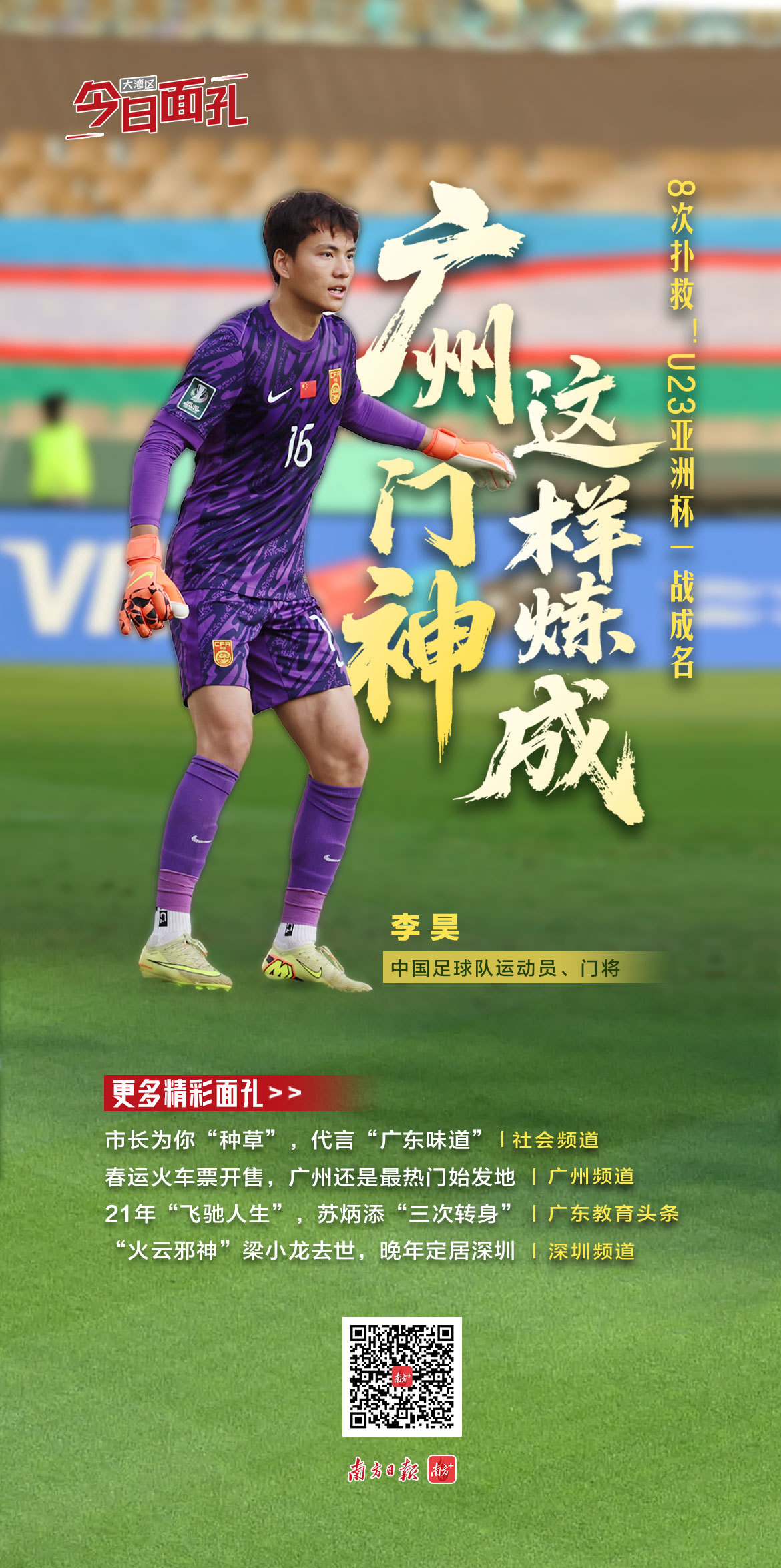 1月17日,U23国足在亚洲杯1/4决赛点球击败乌兹别克斯坦队,时隔22年重返亚洲大赛四强,21岁的广州籍门将李昊发挥神勇贡献8次扑救,一夜之间成为中国足坛最耀眼的新星。