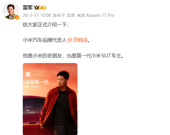 3月17日,小米汽车官方及雷军正式宣布,中国短跑名将苏炳添担任小米汽车品牌代言人。作为小米的老朋友及第一代小米SU7车主,苏炳添对车辆的评价为“信任”,其不断超越自我的体育精神与小米汽车追求极致速度的品牌理念高度契合。来源:@雷军、@小米汽车 编辑 邓聿修 订阅后可查看全文(剩余80%)