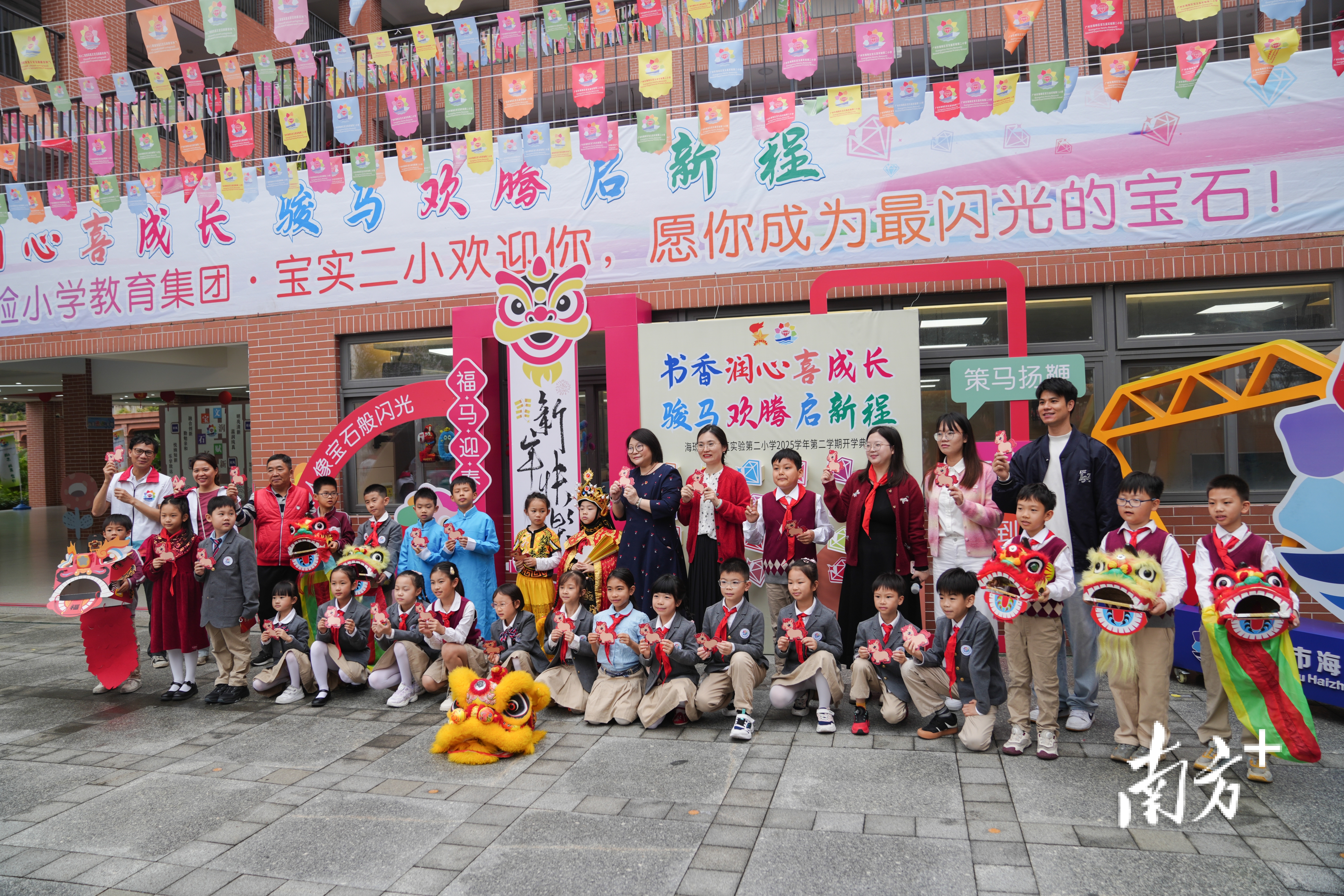 清晨,在热闹的锣鼓声中,广州市海珠区宝玉直实验第二小学各班学生代表组成醒狮小队迎接每一位返校的同学,老师们将“小马好运卡”送到学生手中,祝愿他(她)们马年龙马精神,一马当先。