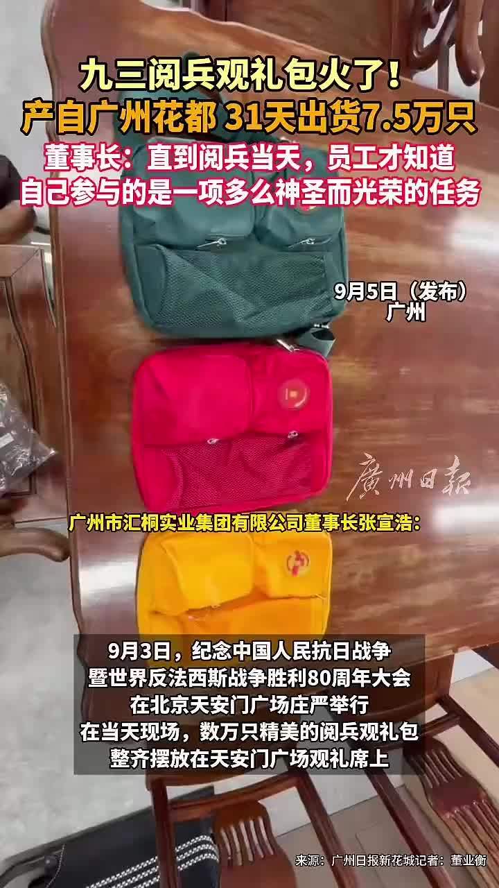 记者了解到,北京天安门广场观礼席上众多亮眼的观礼包正是“广州制造”,产自箱包产业重镇花都狮岭,来自一家名为广州市汇桐实业集团有限公司的箱包制造企业。狮岭被誉为“中国皮具之都”,这里的皮革皮具产业已走过40多年的发展历史。