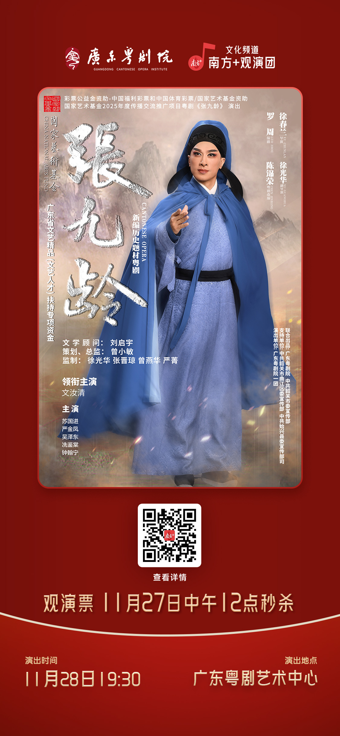 11月28日19时30分,由一级演员文汝清领衔主演,苏国进、严金凤、吴泽东等一众实力派联合主演的粤剧《张九龄》将在广东粤剧艺术中心上演,为观众呈现一场兼具艺术性与观赏性的视听盛宴。