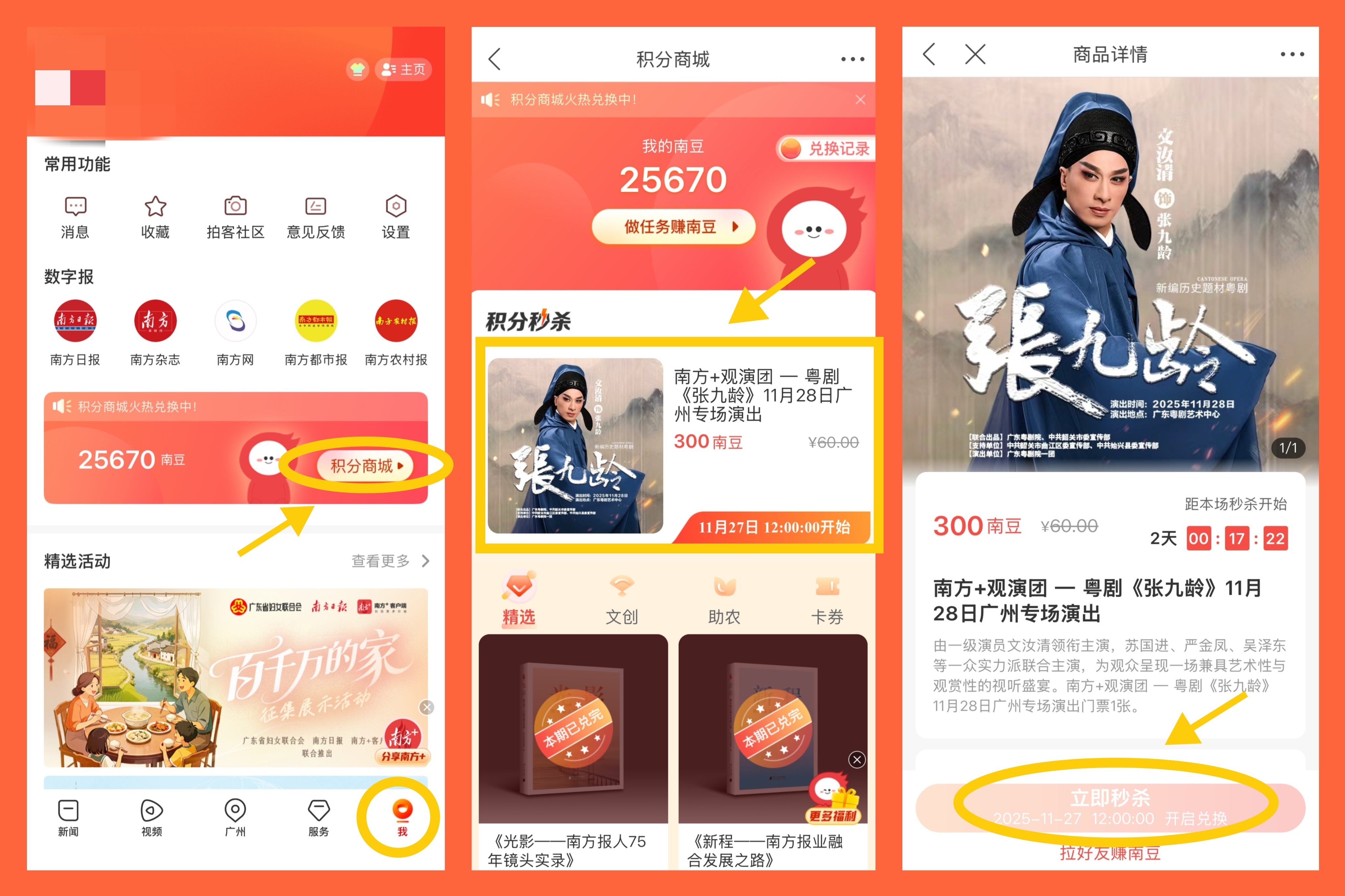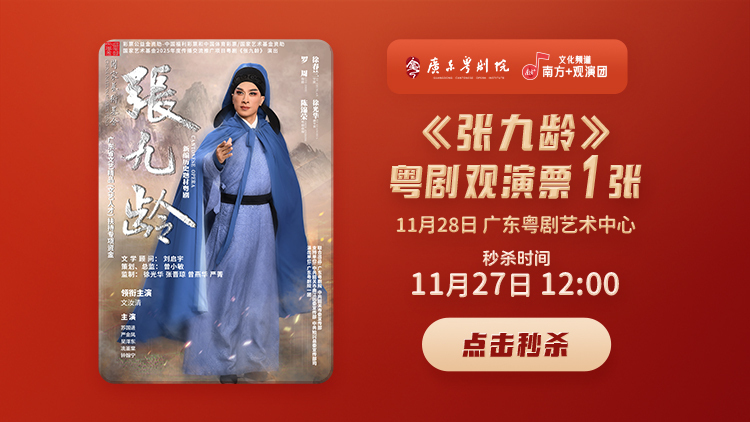 11月27日12时,参与南方+积分商城秒杀活动,仅需300南豆积分,即可获得1张《张九龄》的观演门票。