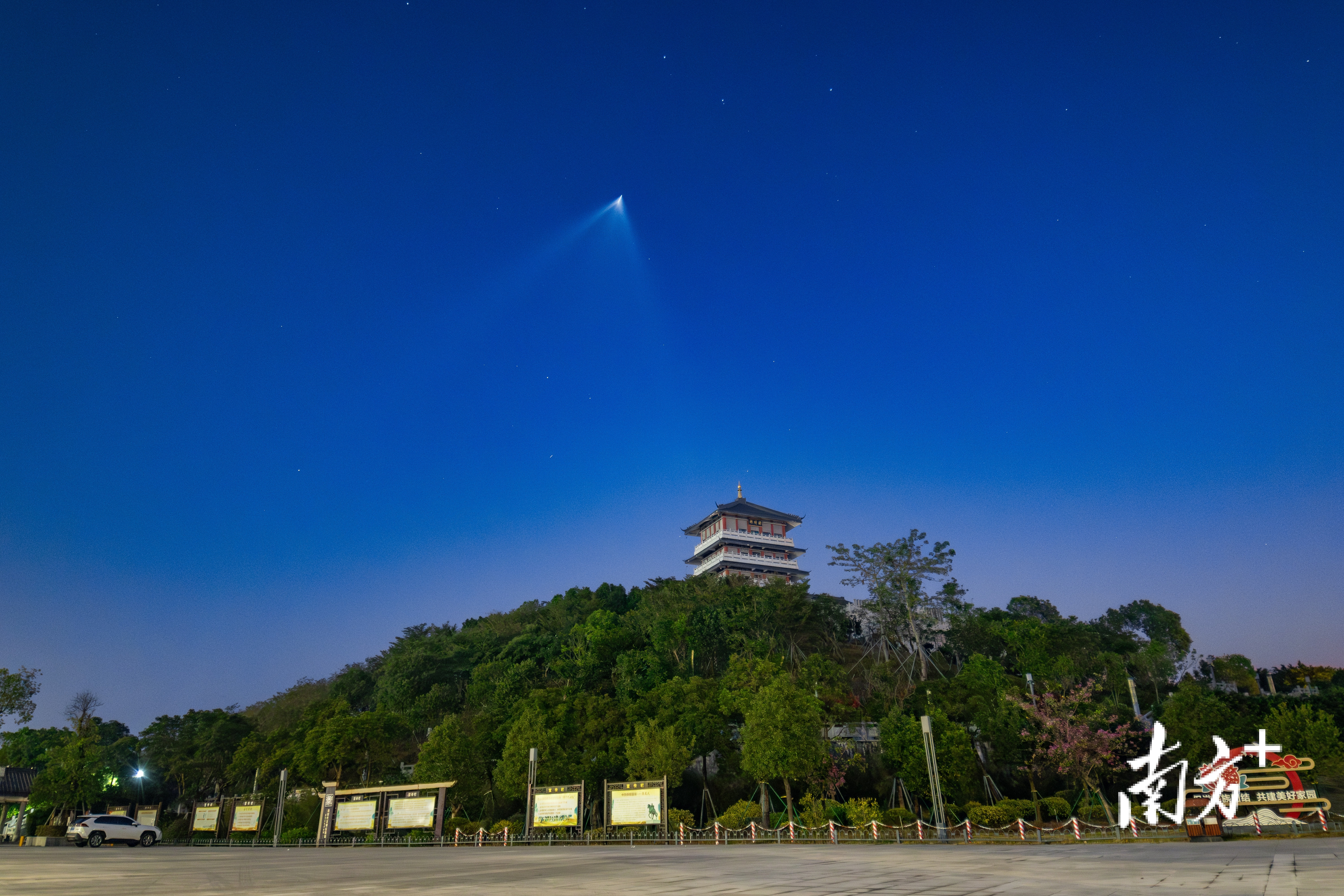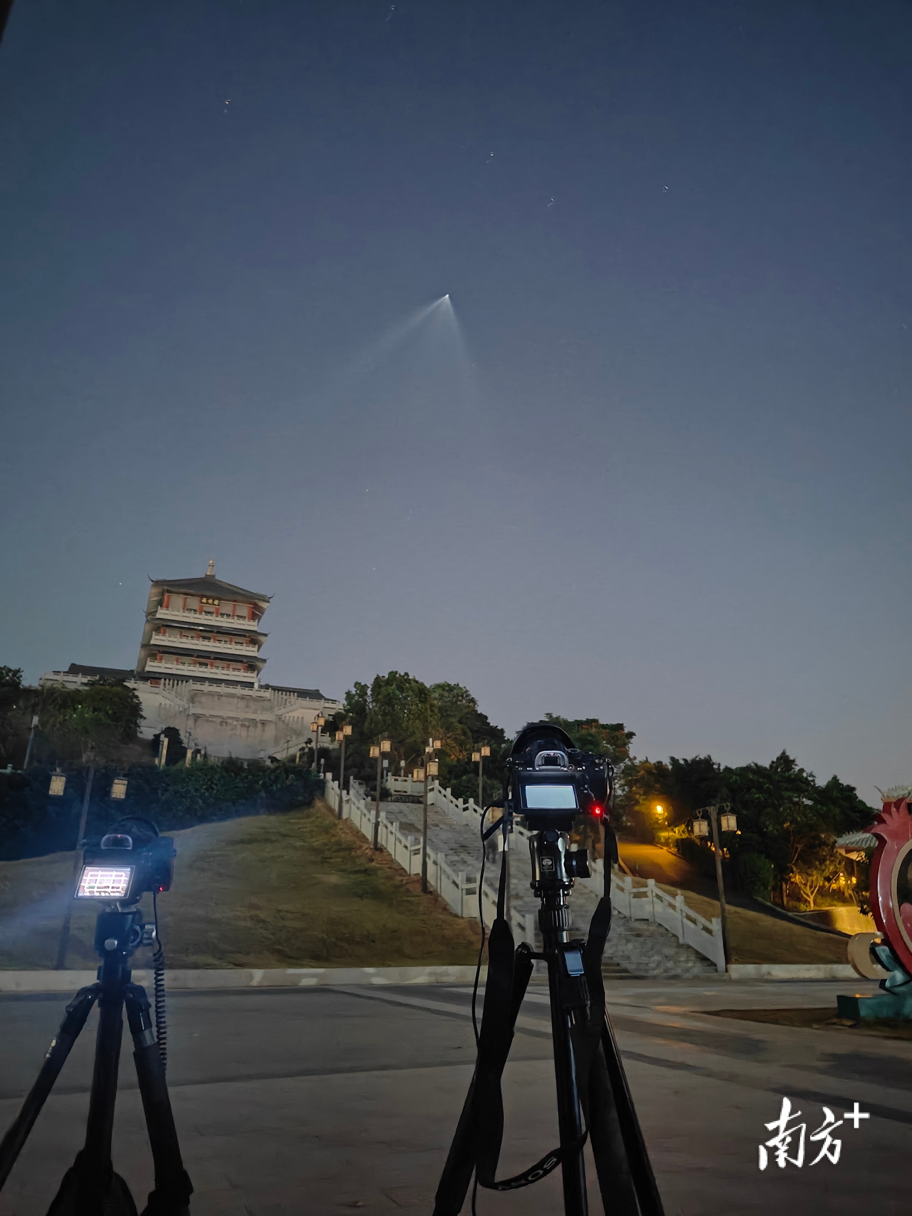12月9日清晨,广东茂名雨顺阁上空还沉浸在一片深蓝之中,天文摄影爱好者曾响已在不同位置架起了三台相机。