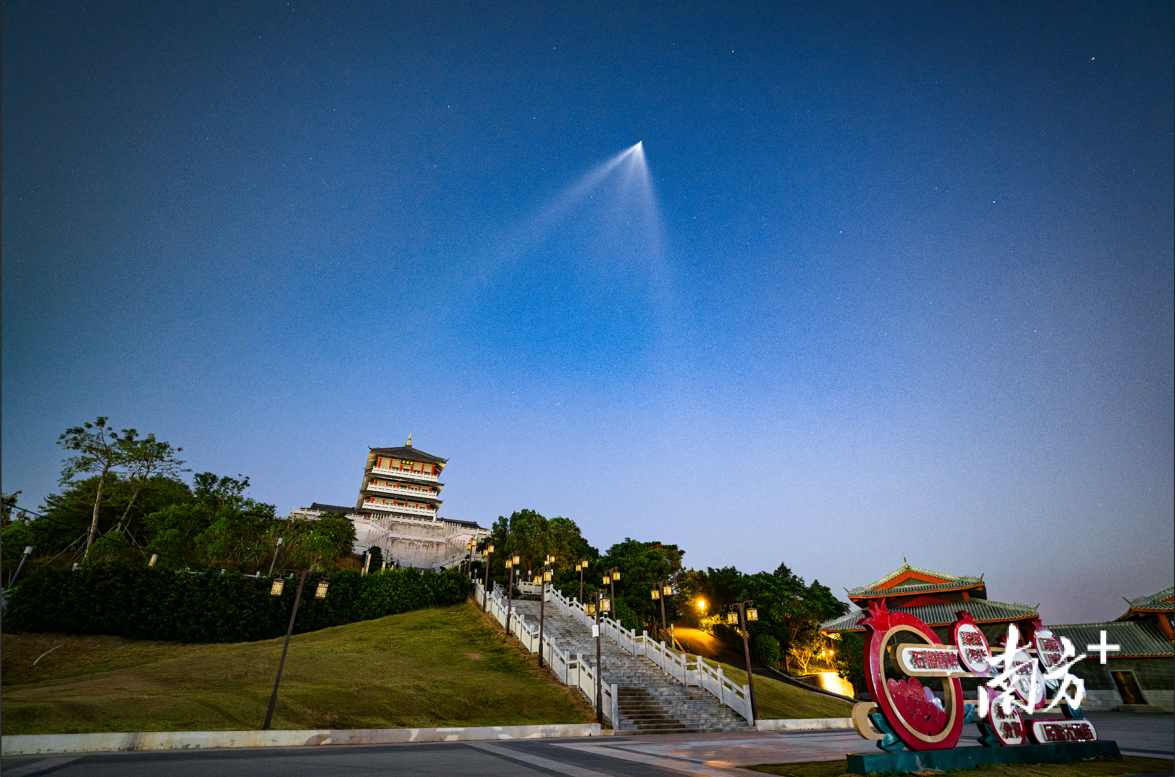 长征六号火箭越过茂名雨顺阁瞬间。南方拍客 曾响 供图