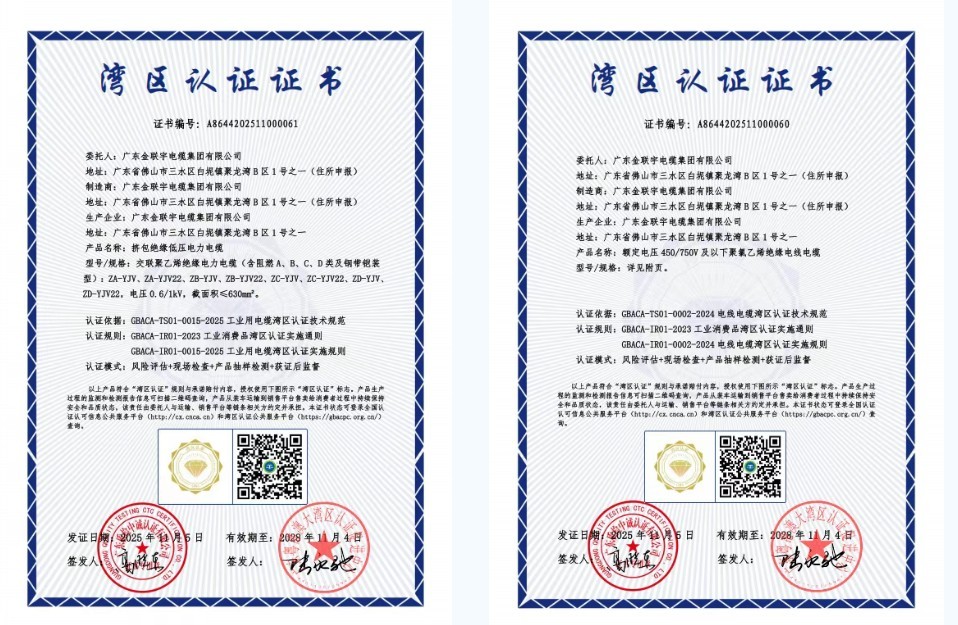 该认证实行“一次认证,三地通行”机制,获证产品可直接满足粤港澳三地市场准入要求。此次金联宇电缆拿下金标认证,意味着其产品在安全性能、耐久性、绿色低碳等关键维度达到粤港澳大湾区高端标准,将大幅提升产品在区域市场的竞争力。