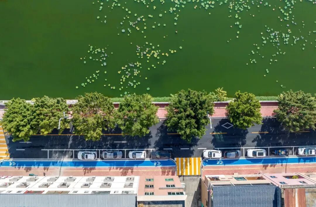 升级改造后,该路段实现了人车分流,有效保障了学生、商户及居民的出行安全。本次工程创新性地采用了充满活力的黄色与蓝色铺装非机动车道与人行区域。这种色彩设计不仅在视觉上令人耳目一新,更从功能上清晰划分了车行空间与慢行空间,从视觉上提醒驾驶员减速注意,为行人、特别是儿童的安全通行提供了双重保障。