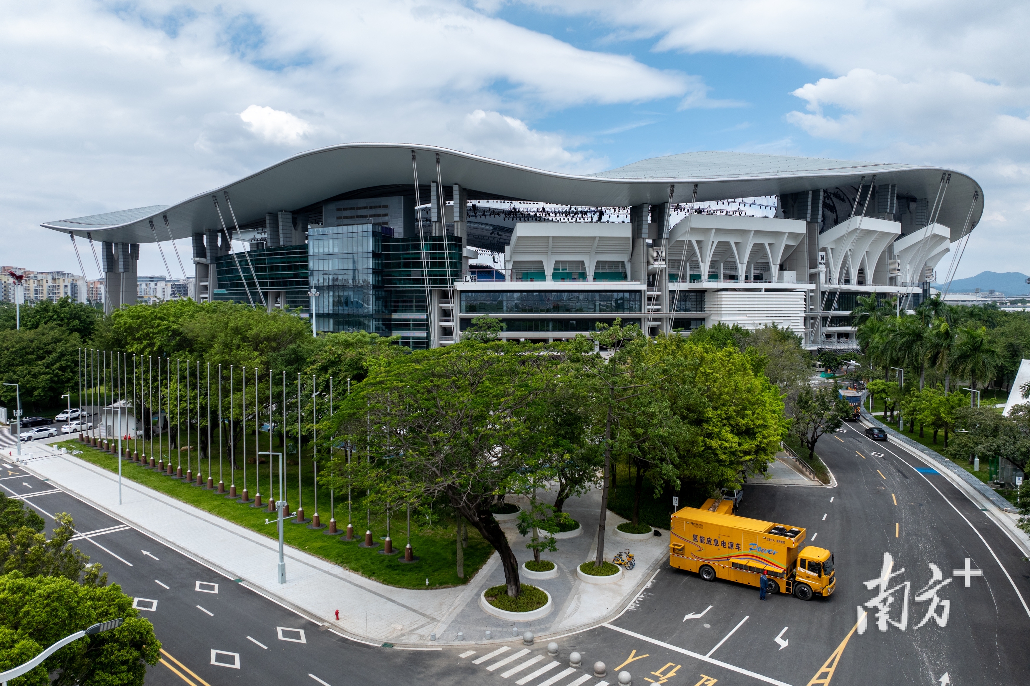 在广东省奥林匹克体育中心场馆外,一辆亮黄色的大型卡车引人注目,这是全国首台基于固态储氢技术的氢能应急电源车。“它可以实现200千瓦额定功率下持续对外供电6小时,为赛事应急保电筑起一道‘绿色’防线。”广州电力科学研究院电氢转换技术研发室经理黄旭锐介绍。