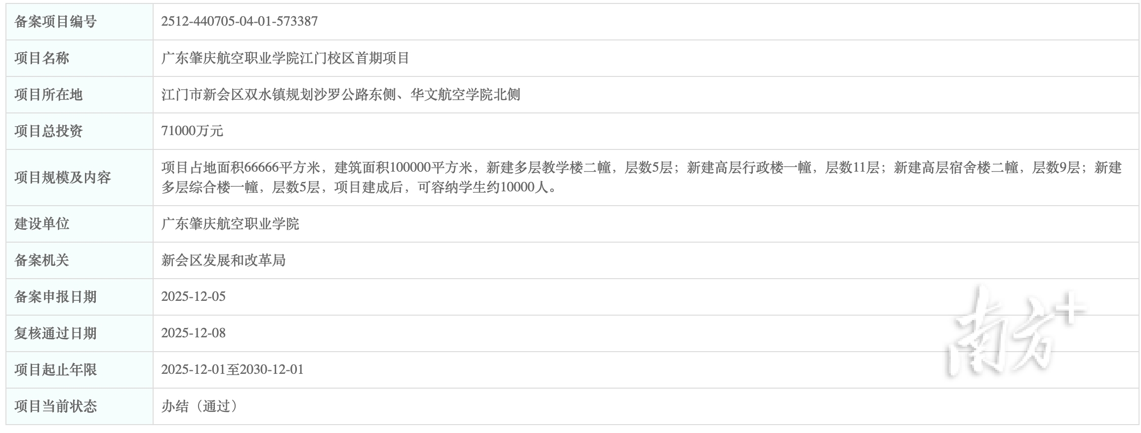 12月8日,广东省投资项目在线审批监管平台发布《广东肇庆航空职业学院江门校区首期项目》备案公告,江门再迎新高校。