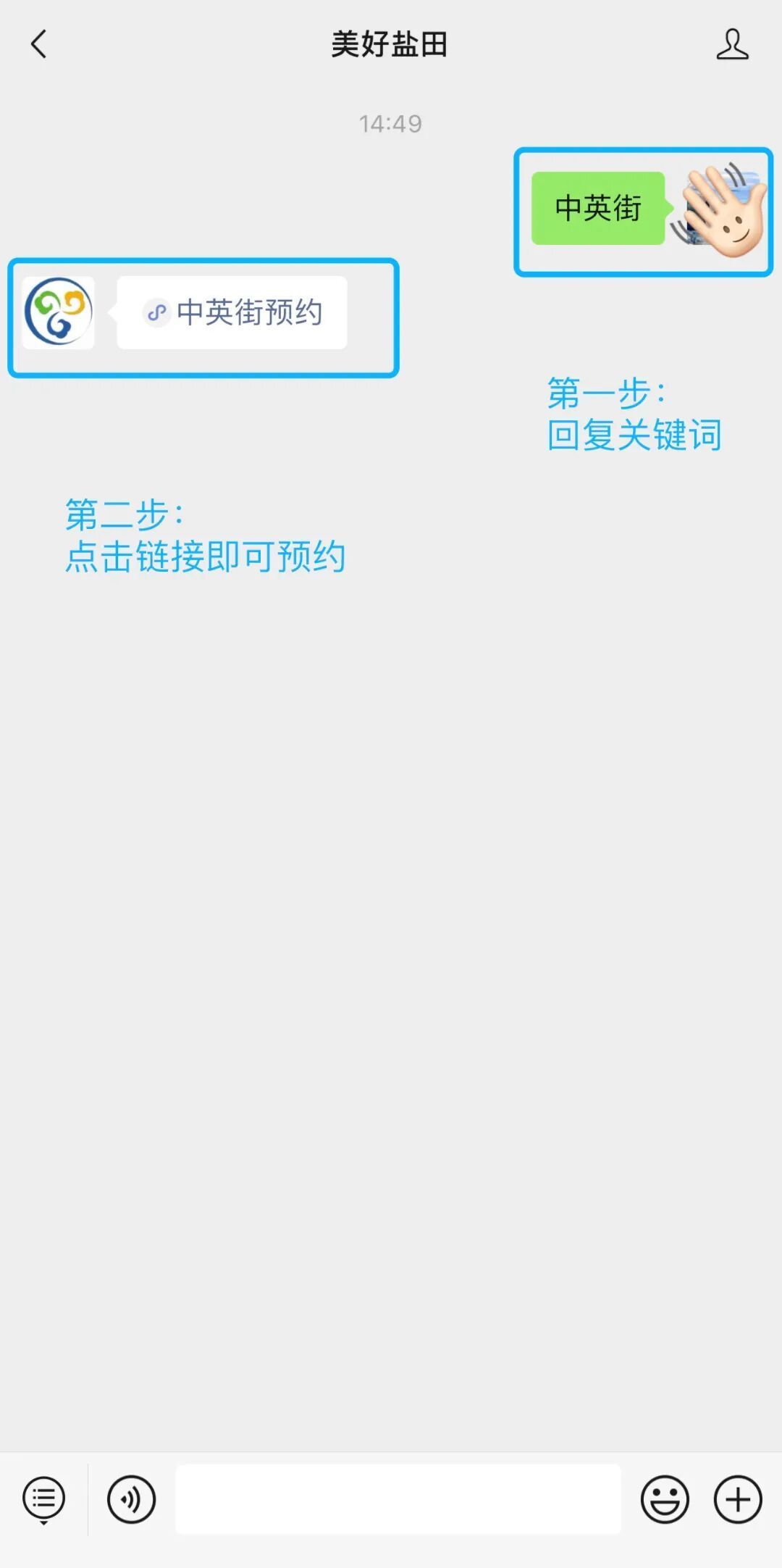 方法一:在【美好盐田】微信公众号后台回复关键词【中英街】,即可进入预约页面。