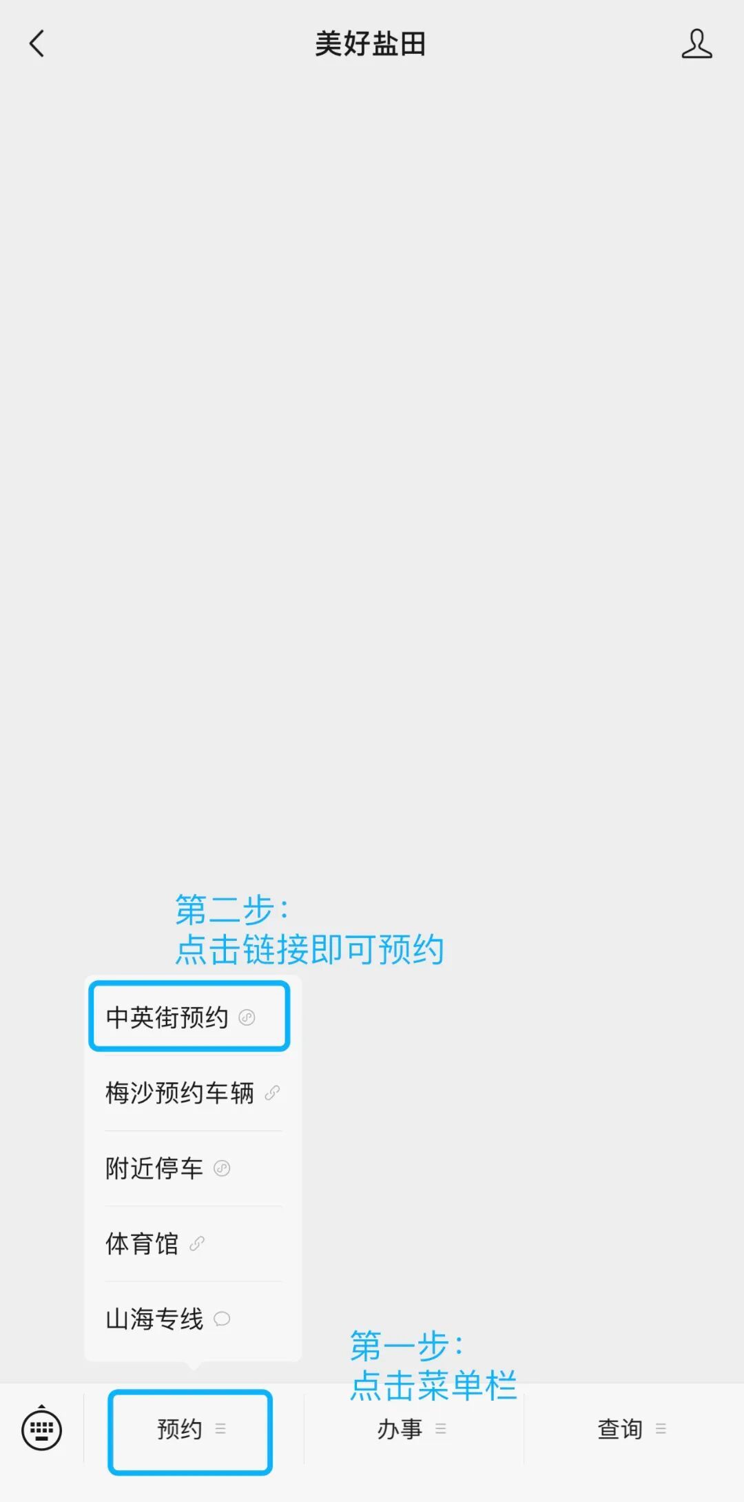 方法二:在【美好盐田】微信公众号后台点击菜单栏“预约→中英街预约”,即可进入预约页面。