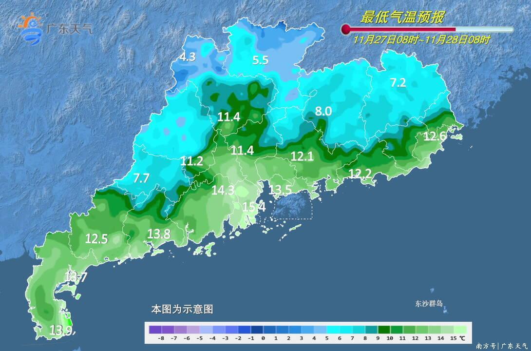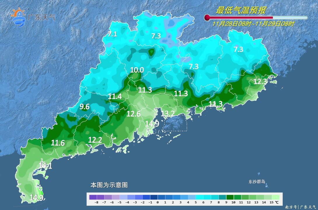 具体来看,28日,我省大部晴间多云。最低气温:粤北、肇庆和云浮市县2~8℃,局部有霜冻,南部沿海市县12~14℃,其余市县9~12℃。