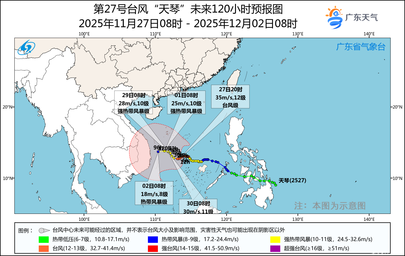 今年第27号台风“天琴”于27日凌晨加强为台风级,27日08时,其中心位于距离海南省三沙市(西沙永兴岛)南偏东方约455公里的南海南部海面上。