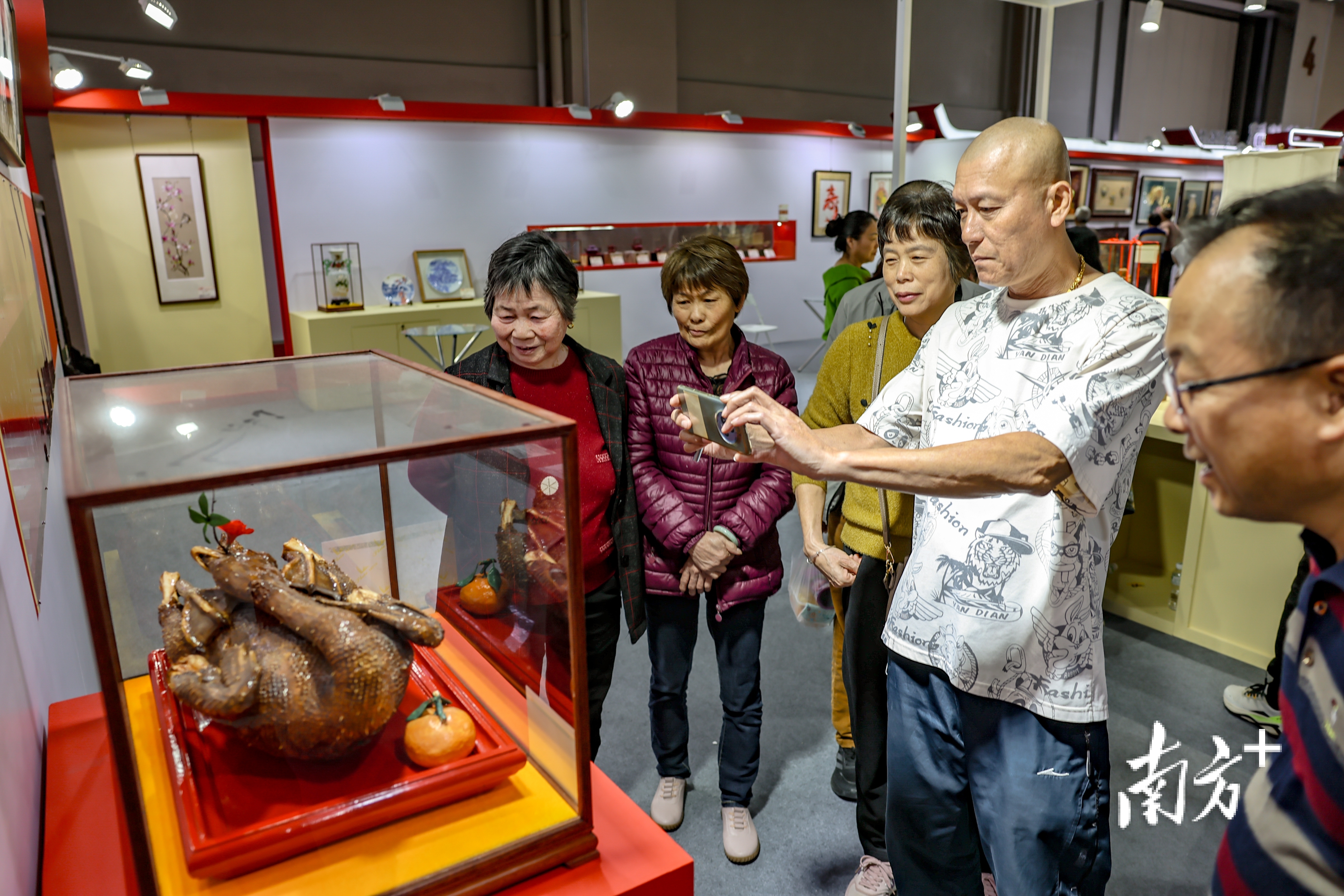 潮绣大师康惠芳的《岁朝清供》前,观众挤得水泄不通。该作品曾获中国民间文艺最高奖“山花奖”,2023年同款作品在中法两国元首非正式会晤现场亮相。作品采用金绒合体的创新工艺,用金线银线勾勒出的的瓜果花瓶栩栩如生,引来阵阵赞叹。“太震撼了!”摄影爱好者章先生举着相机不停拍摄记录,“这次展览的精品很多,特别是雕塑、潮绣作品,让人看花了眼。”他表示,希望潮州多举办工艺美术展览,让潮州高雅的艺术能更“亲民”,更多走进大众的视野。