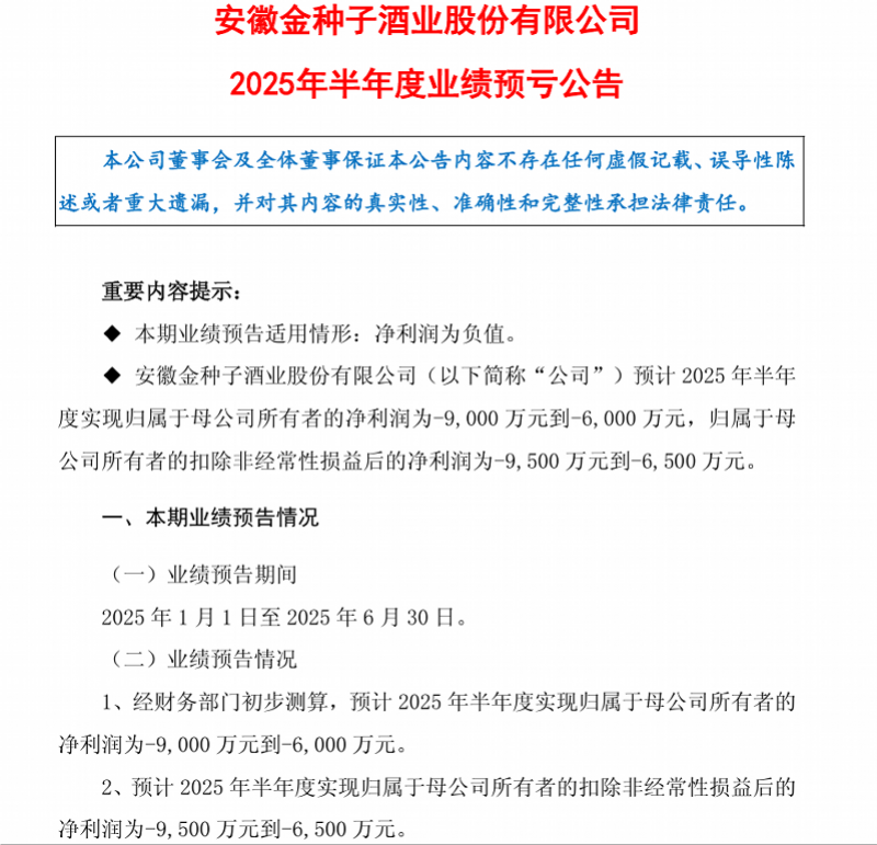 7月14日,金种子酒公布2025年半年度业绩预亏公告,预计2025年半年度实现归属于母公司所有者的净利润为-9000万元到-6000万元,归属于母公司所有者的扣除非经常性损益后的净利润为-9500万元到-6500万元。