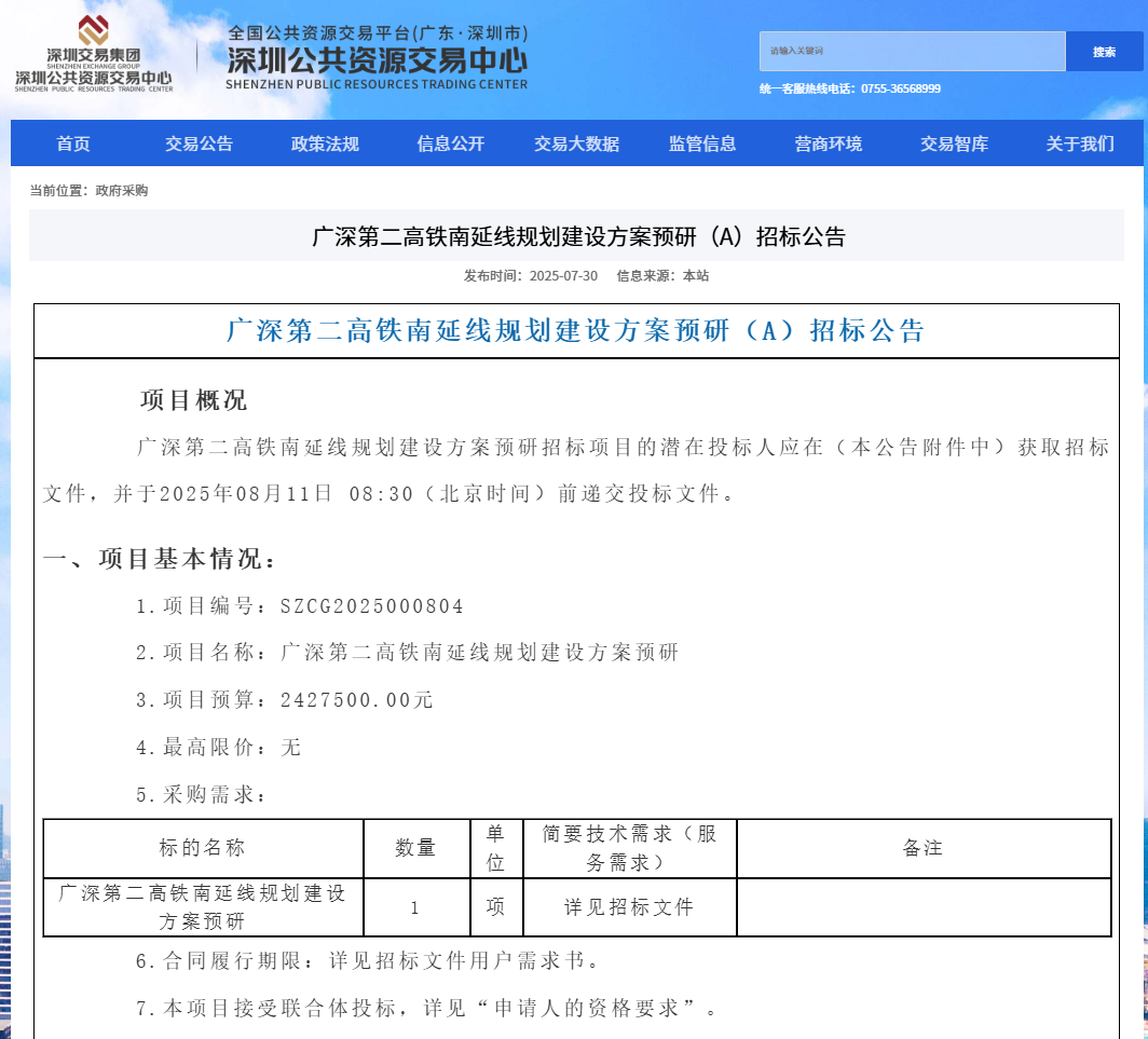 近日,深圳公共资源交易中心公告信息显示,深圳市发展和改革委正式启动广深第二高铁南延线规划建设方案预研招标,预计将与港深西部铁路协同,进一步密切香港与内地的联系。