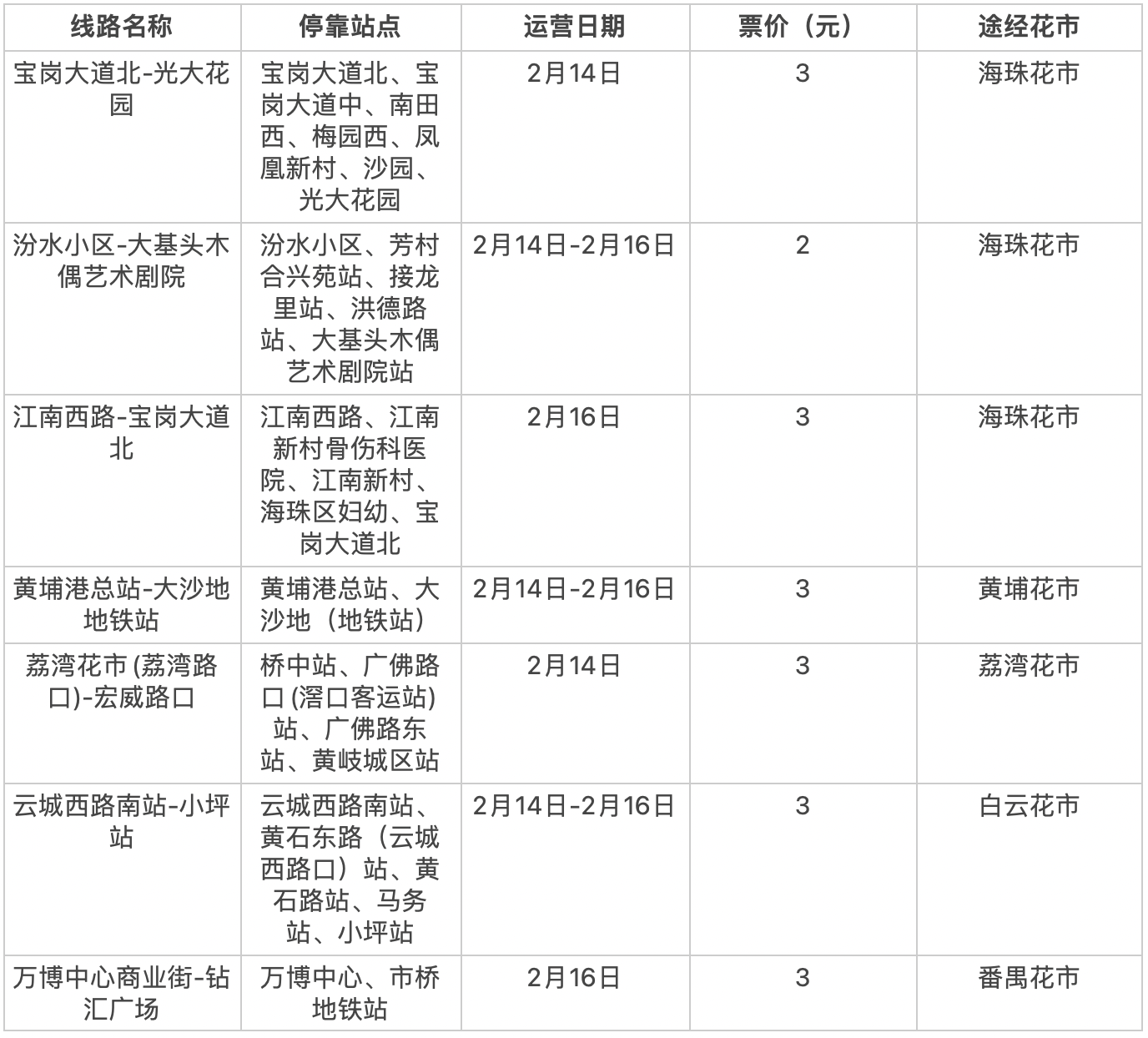 荔湾区、海珠区相关公交线路及站点调整时段为2月6日首班车至2月17日末班车;