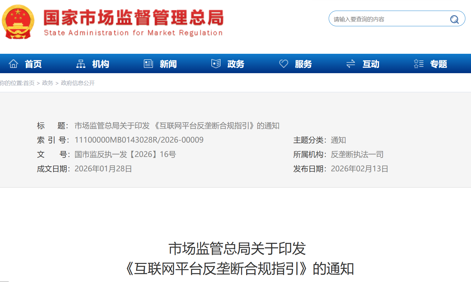 2月13日,国家市场监管总局对外发布了《互联网平台反垄断合规指引》(下文简称《指引》),重点规定了垄断协议、滥用市场支配地位、经营者集中和滥用行政权力排除、限制竞争等4类垄断风险,不仅为平台经营者划出清晰明确的“红线”,同时将《中华人民共和国反垄断法》的系列核心条款转化为具体可识别的行为边界。根据平台经济行业特点、经营模式、竞争规律等,指引提出了8个场景中的新型垄断风险,包括:平台间算法共谋、组织帮助平台内经营者达成垄断协议、平台不公平高价、平台低于成本销售、封禁屏蔽、“二选一”行为、全网最低价、平台差别待遇,为平台经营者加强反垄断合规管理提供可操作性强的指导建议。