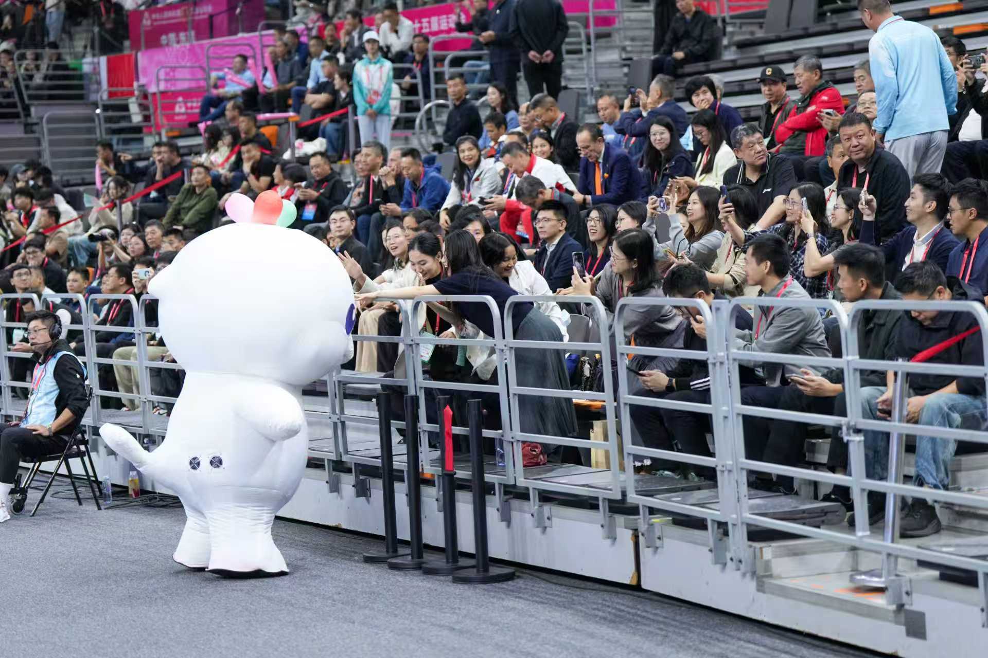 十五运会男篮成年组现场,吉祥物“喜洋洋”与观众互动。南方+记者 龚名扬 摄。