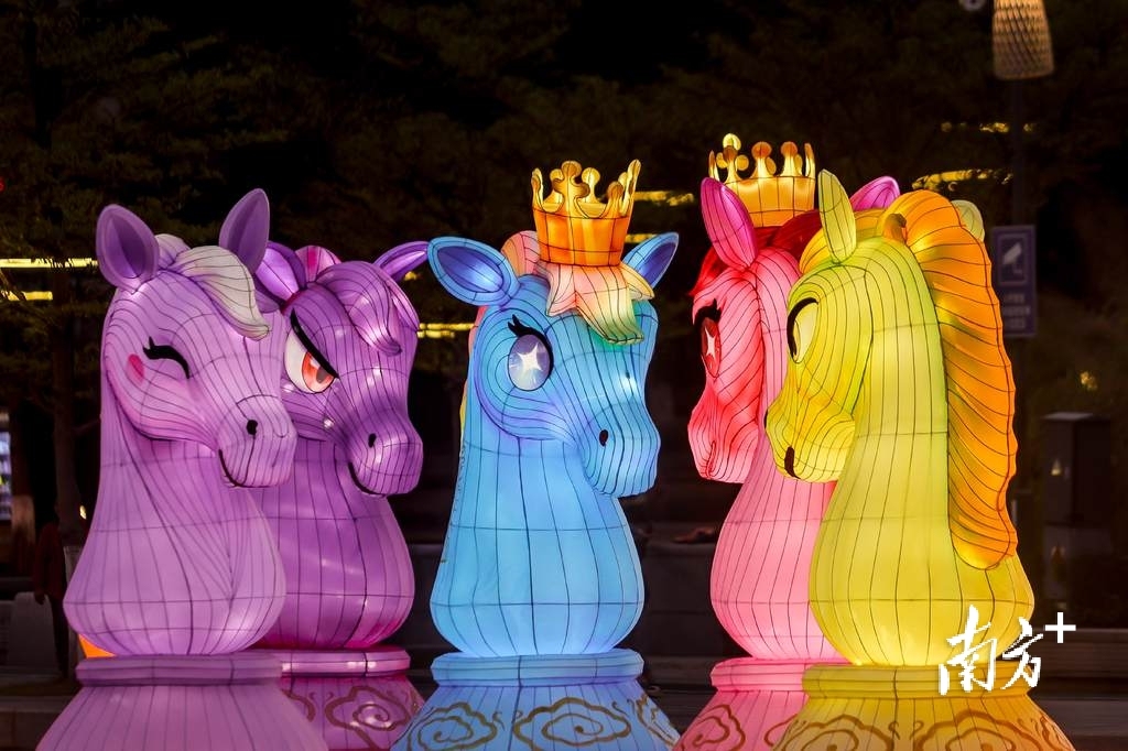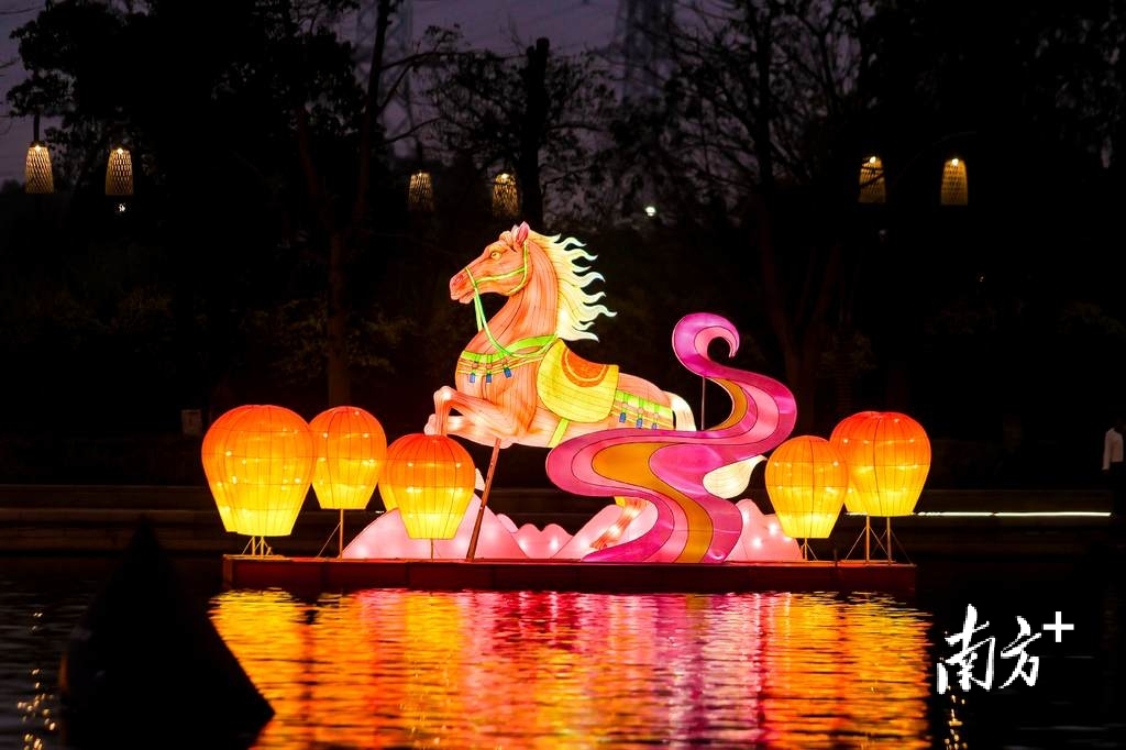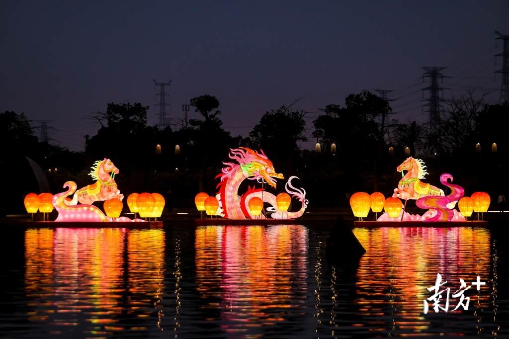 其中,高达10米的“乐安花灯”采用传统扎作技艺,辅以马卡龙色调,湖中倒影尤为灵动,成为市民拍照打卡的热点;“马上来财”灯组则融入狮山官窑生菜会元素,以生菜造型为灵感,借助粤语“以水为财”谐音,传递“马上生财”的吉祥寓意,灯组高3.5米,配以流光与烟花灯效,璀璨夺目。