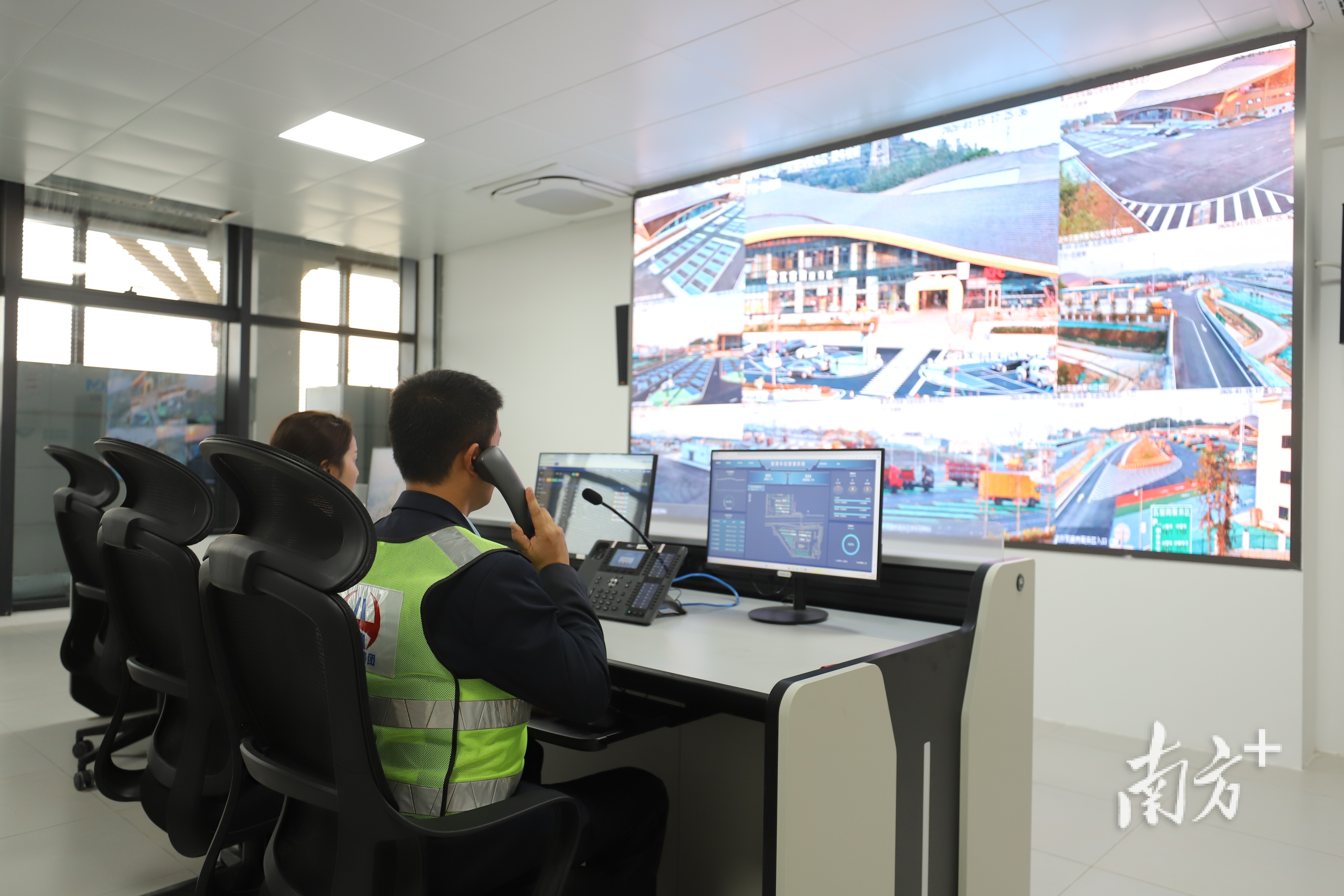 这是广韶高速智慧云舱的应用场景。该云舱于2025年12月建成投用,目前在钟落潭站、鳌头站各设置了1个,构建起“一屏观多站、一人管多岗”的集约化运营模式。司乘如需帮助,可一键求助,喊话云舱内的工作人员对接解决。据统计,以往约60%需人工现场处置的特情种类,如今通过云舱平均19秒即可完成响应处置,效率提升近一倍。