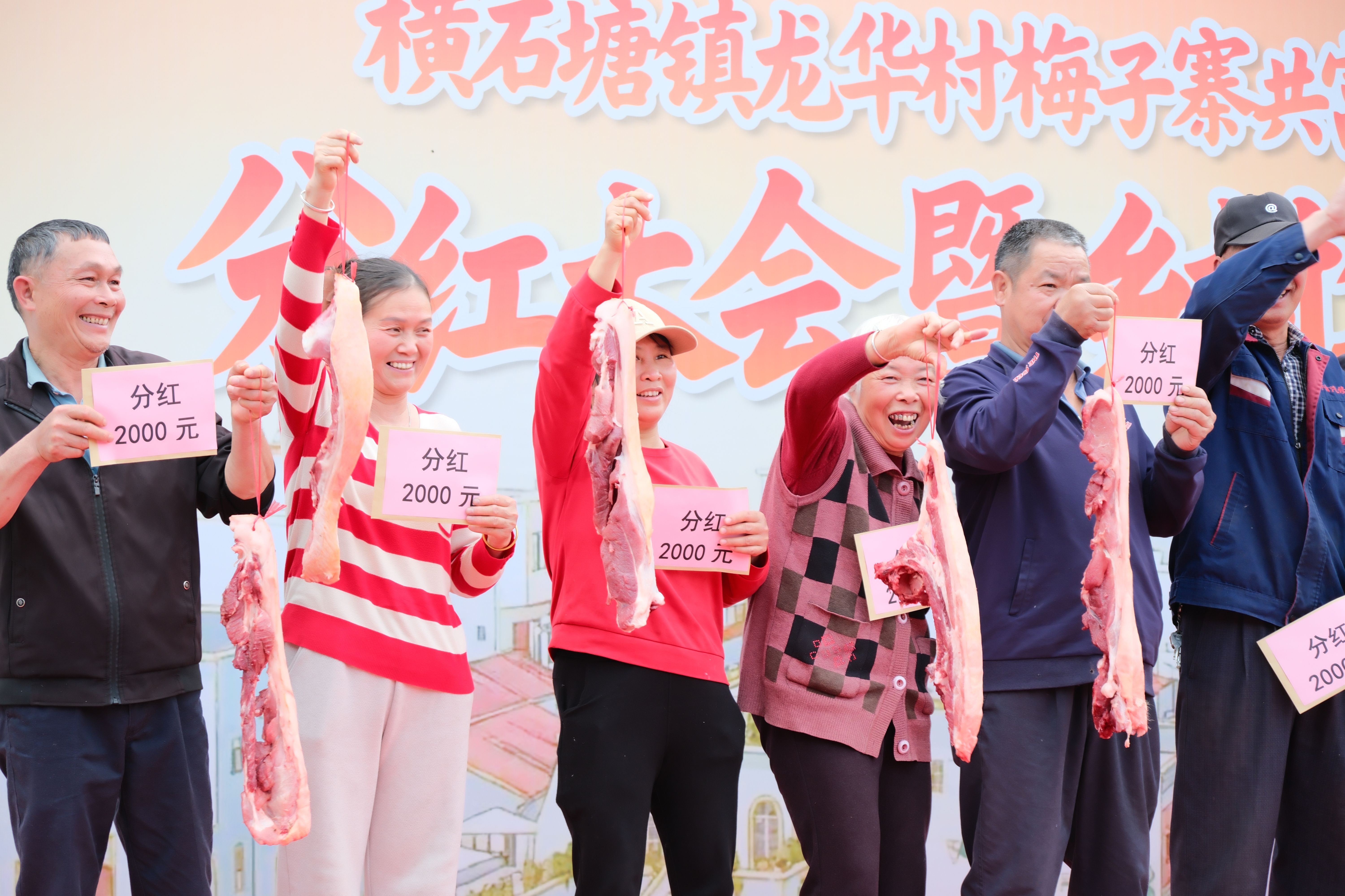 “我分红领了2000元!”2月6日,英德市横石塘镇龙华村梅子寨,33户村民齐聚一堂,喜提专属“共富红包”。在分红大会上,33户村民代表分三批上台,不仅拿到了沉甸甸的分红红包,每户村民还领到3斤猪肉。