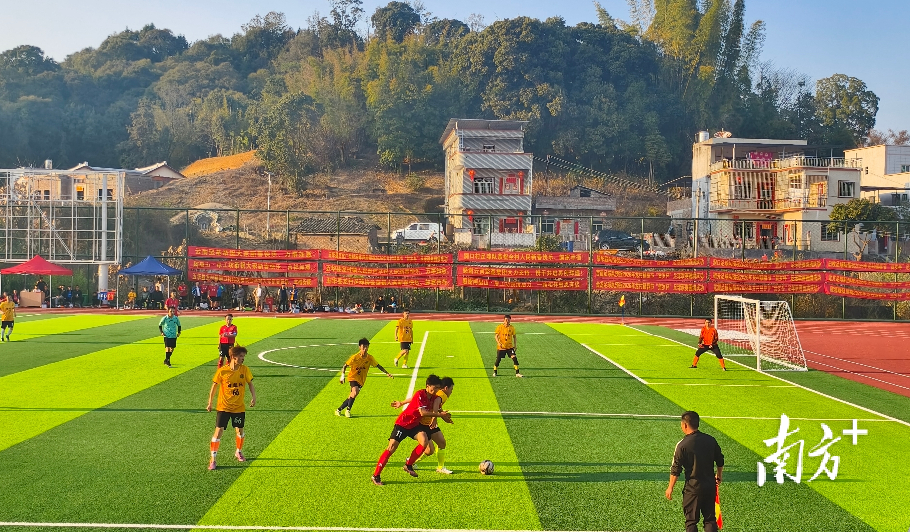 如今的体育场,不仅成了村里孩子课后奔跑玩耍的乐园,成了五华村超赛事的核心赛场,更成了整个龙村镇最热闹的青年聚集地。春节期间,不少周边村镇的青年球队都专程赶来,在这片球场上切磋球技。这些在外读书、工作的年轻人,也终于有了一个属于自己的“青春主场”,不用再羡慕城里的球场,不用再为了踢一场球跑十几公里的路。