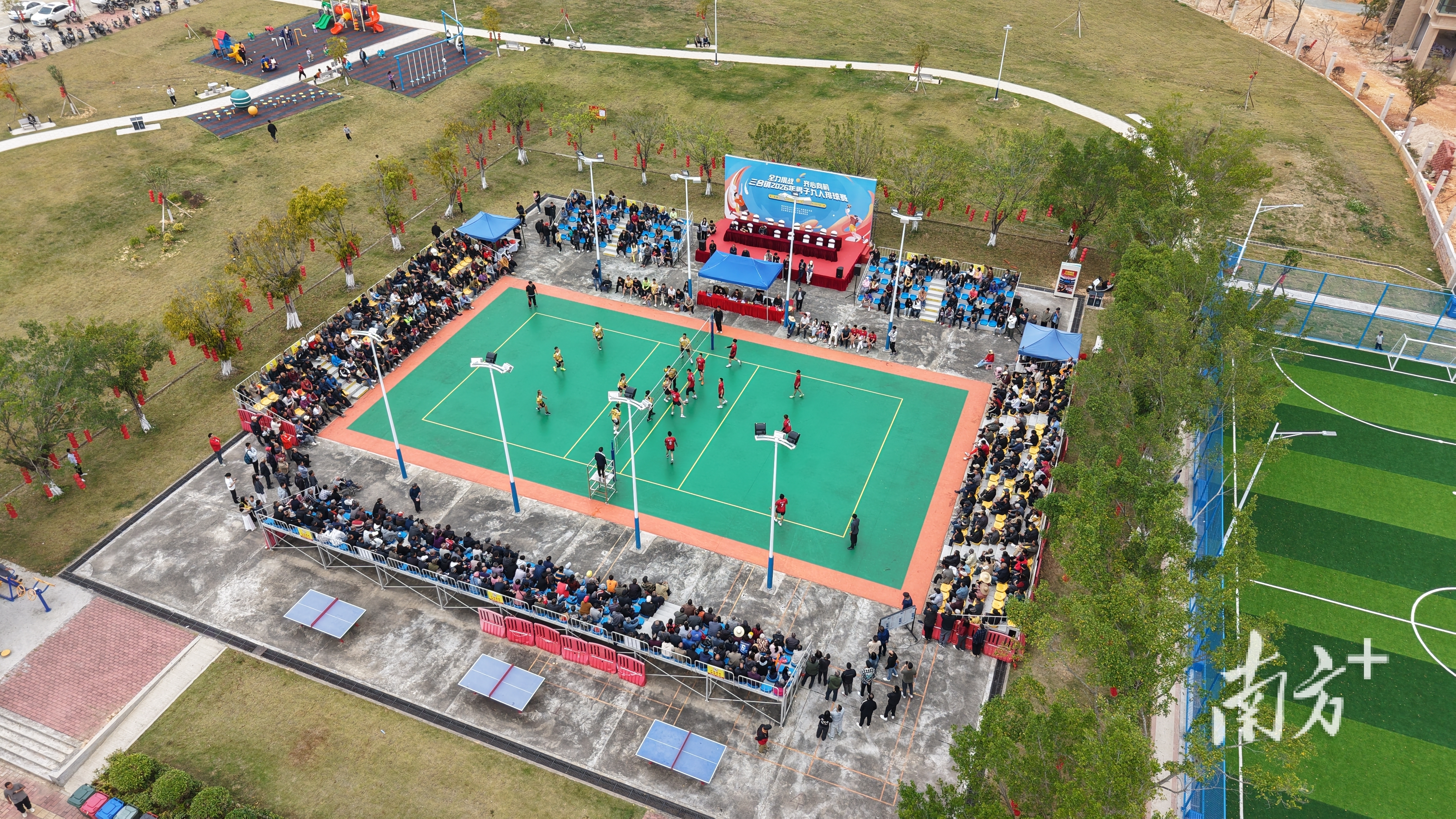 2月11日,江门台山三合镇,天气暖得像春天提前到来。镇政府旁的排球场,两支来自不同村子的队伍正在热身,为即将开始的比赛做最后准备。