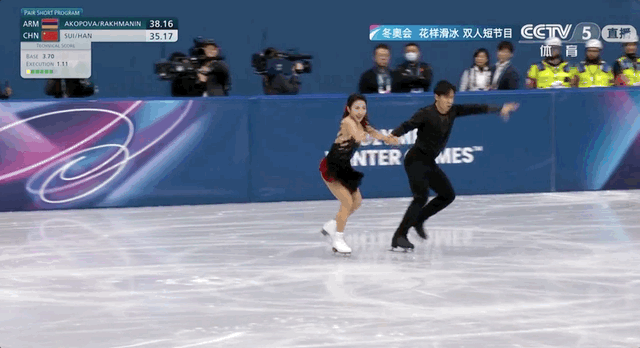 他们的开场并不顺利,进行后外点冰三周跳动作时,隋文静出现了翻身失误。好在这对老将组合稳住节奏,随后捻转三周、抛跳三周、托举等动作均完成得干净漂亮,顺利晋级。