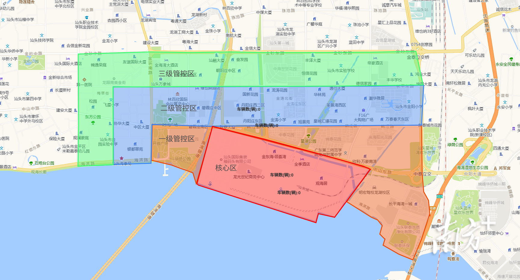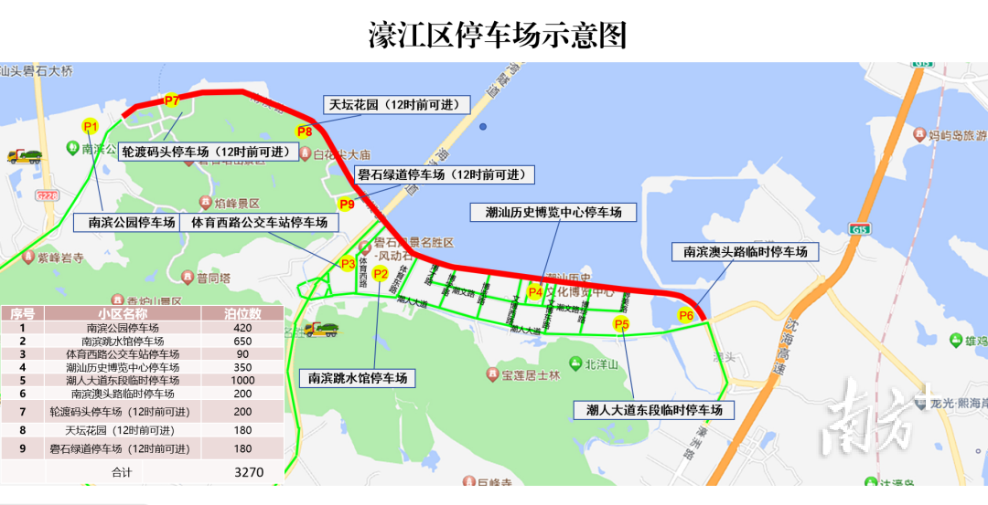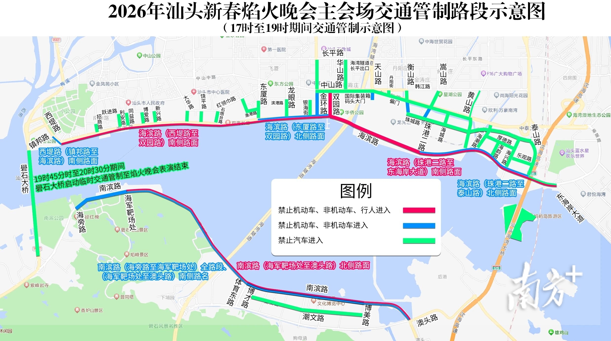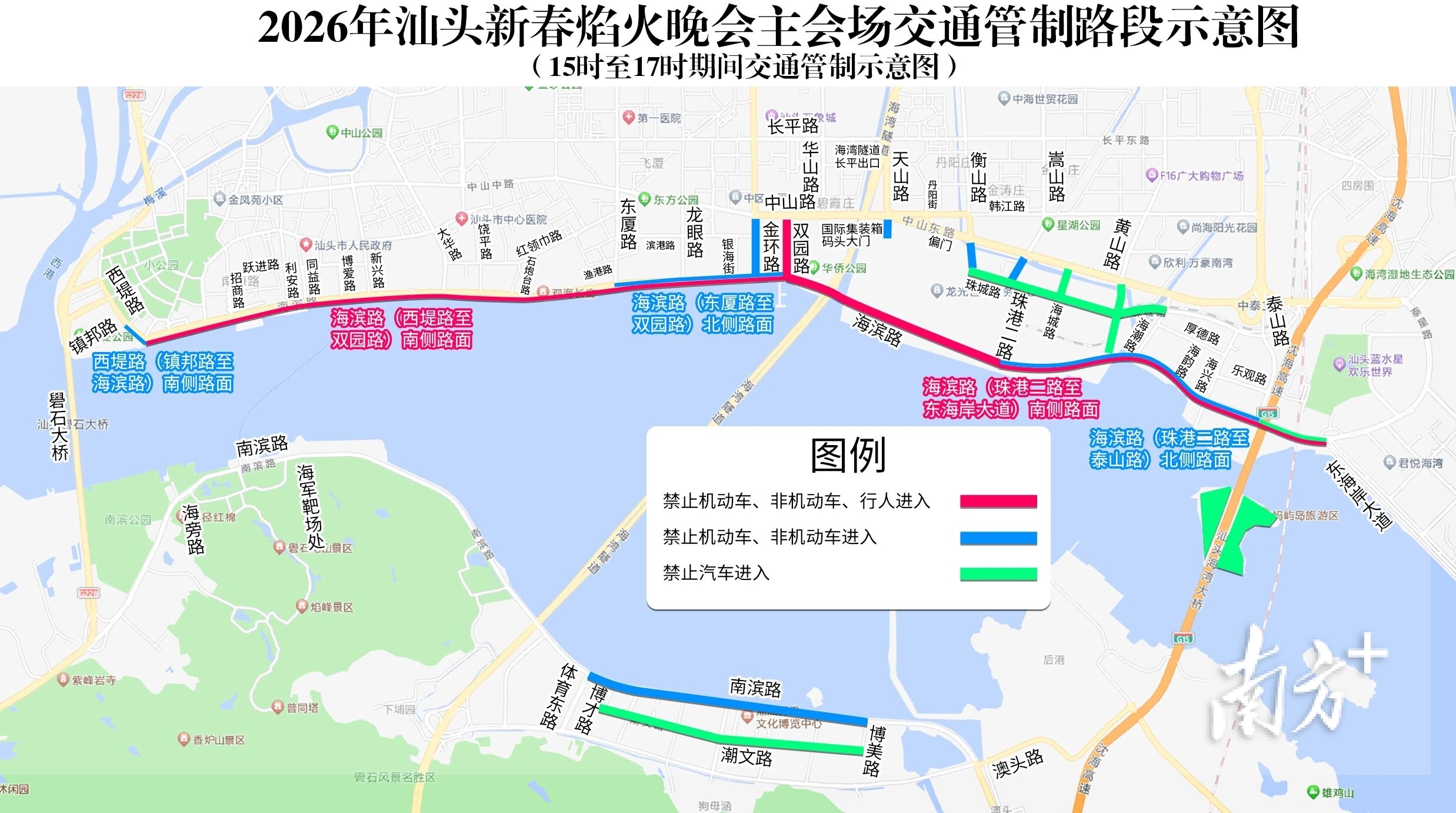 珠城路(衡山路至海潮路)、海城路(珠城路至中山路)、黄山路(海滨路至中山路)、海湾隧道长平出口、潮文路(博才路至博美路)、妈屿岛等区域(道路)禁止汽车进入。