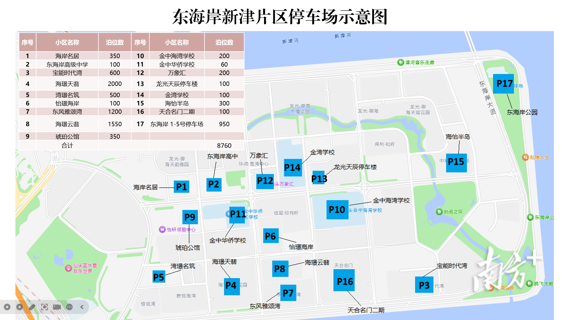 主观赏区设有二轮车停车场,供市民摩托车、电动车、自行车集中停放。位置如下图所示,P1、P2、P3为共享单车与市民二轮车停放区、P4为共享单车停放区、P5为市民二轮车停放区。