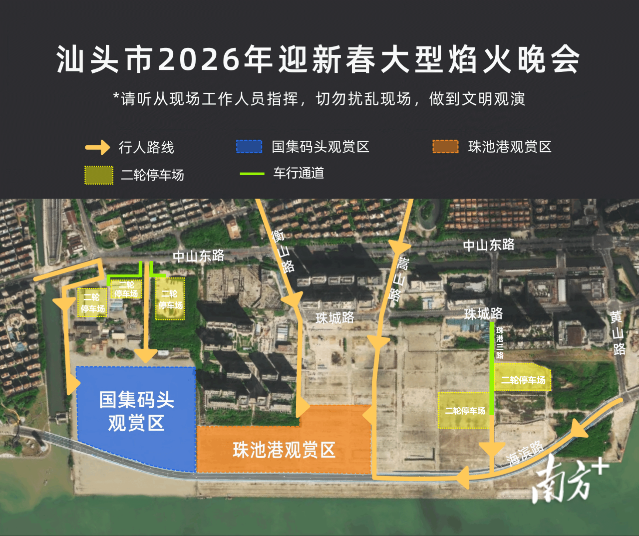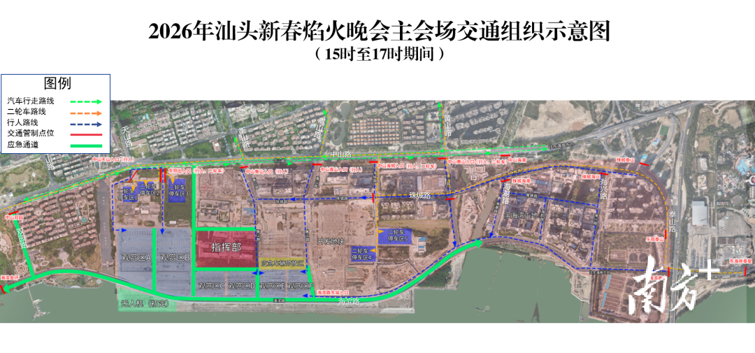 2月18日(正月初二)晚8时,“马汕有好事”汕头市2026年迎新春大型焰火晚会将在国际集装箱码头周边及对开海面举行。届时,市民游客如何进入观赏区?车停哪里?汕头市2026年迎新春大型焰火晚会指挥部办公室精心整理了一份出行攻略,为市民游客提供便利。