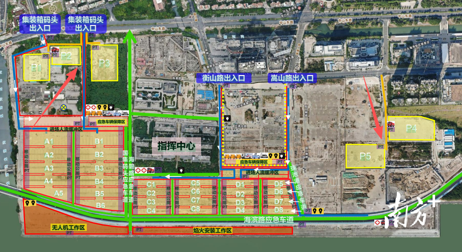 国集码头观赏区路线(建议天山路以西观众前往):沿中山东路骑行至国际集装箱码头大门或西门,根据现场指引进入停车场。