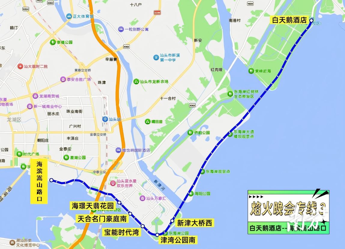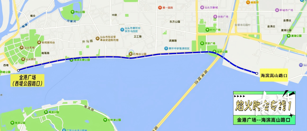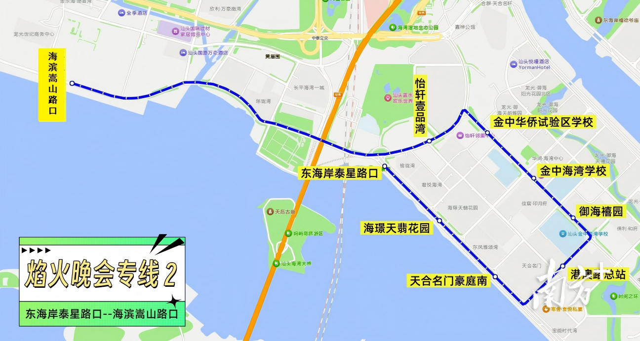 本次晚会开设3条公交接驳专线,并结合汕头站现有公交线路保障市民群众前往焰火晚会周边: