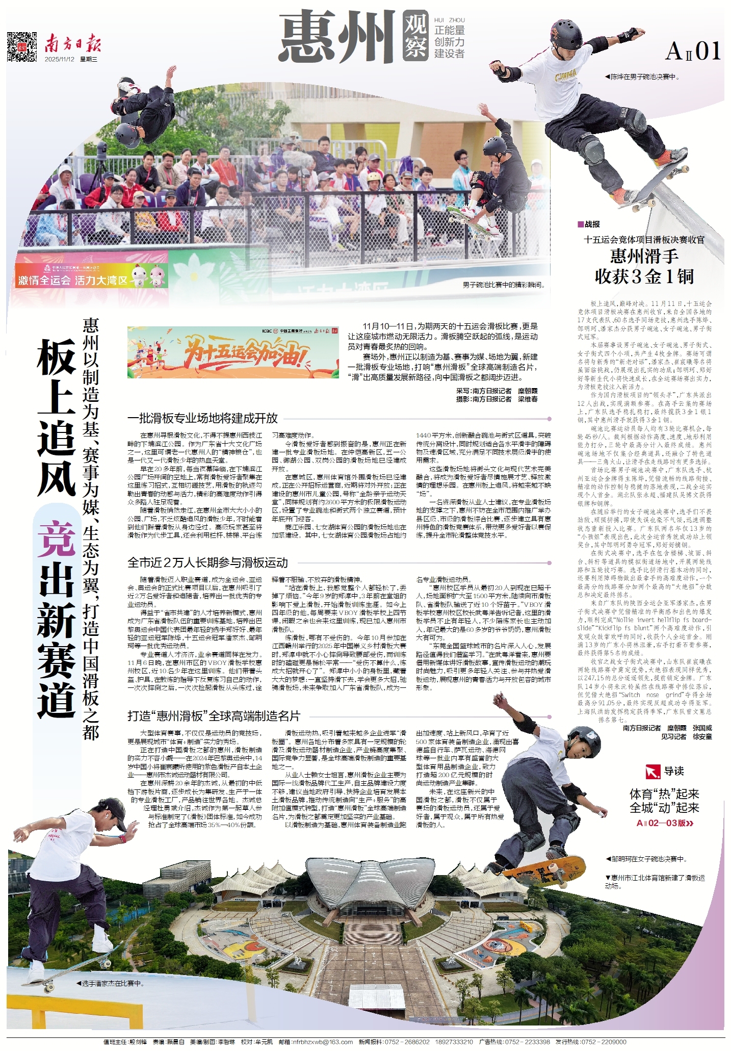 赛场外,惠州正以制造为基、赛事为媒、场地为翼,新建一批滑板专业场地,打响“惠州滑板”全球高端制造名片,“滑”出高质量发展新路径,向中国滑板之都阔步迈进。