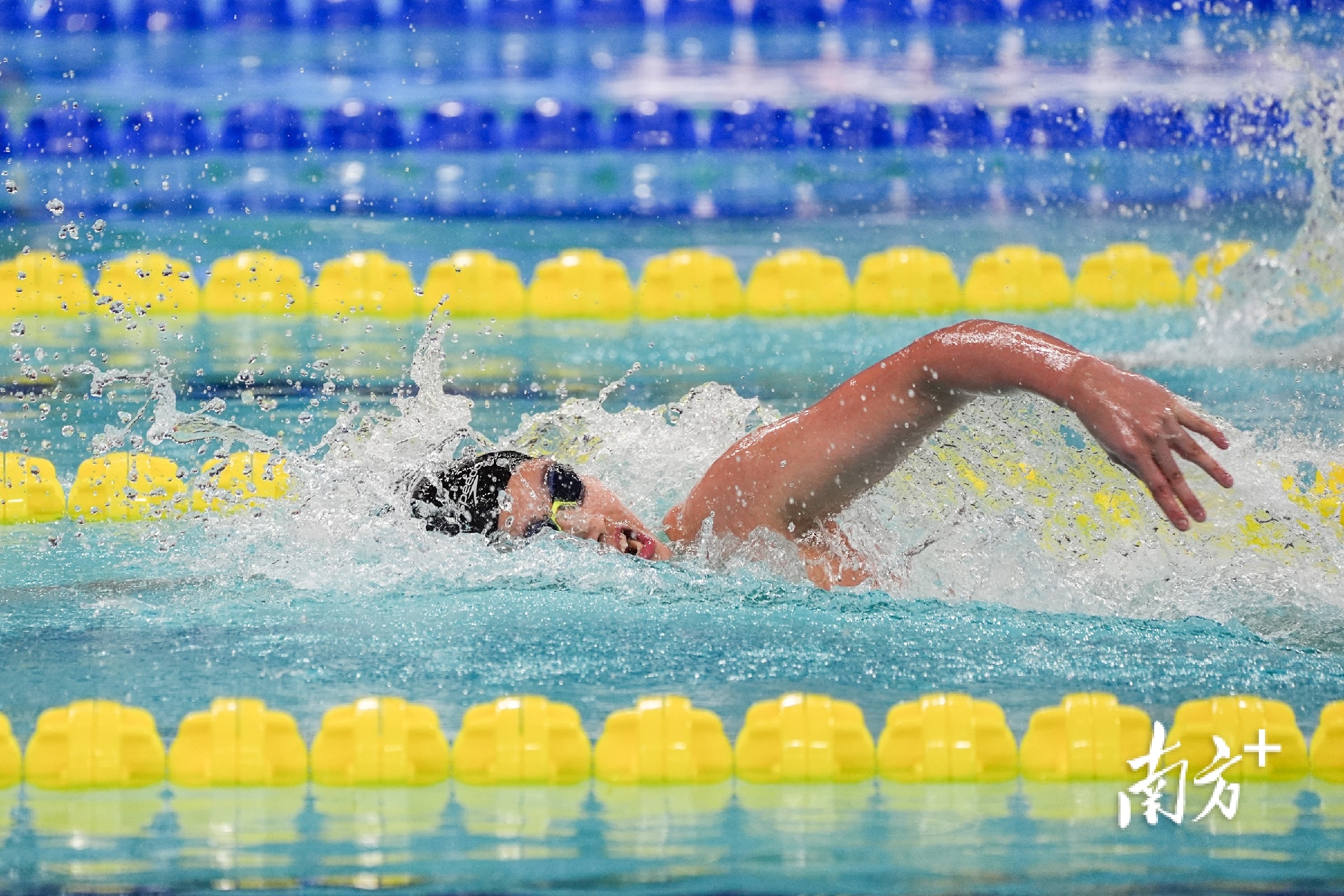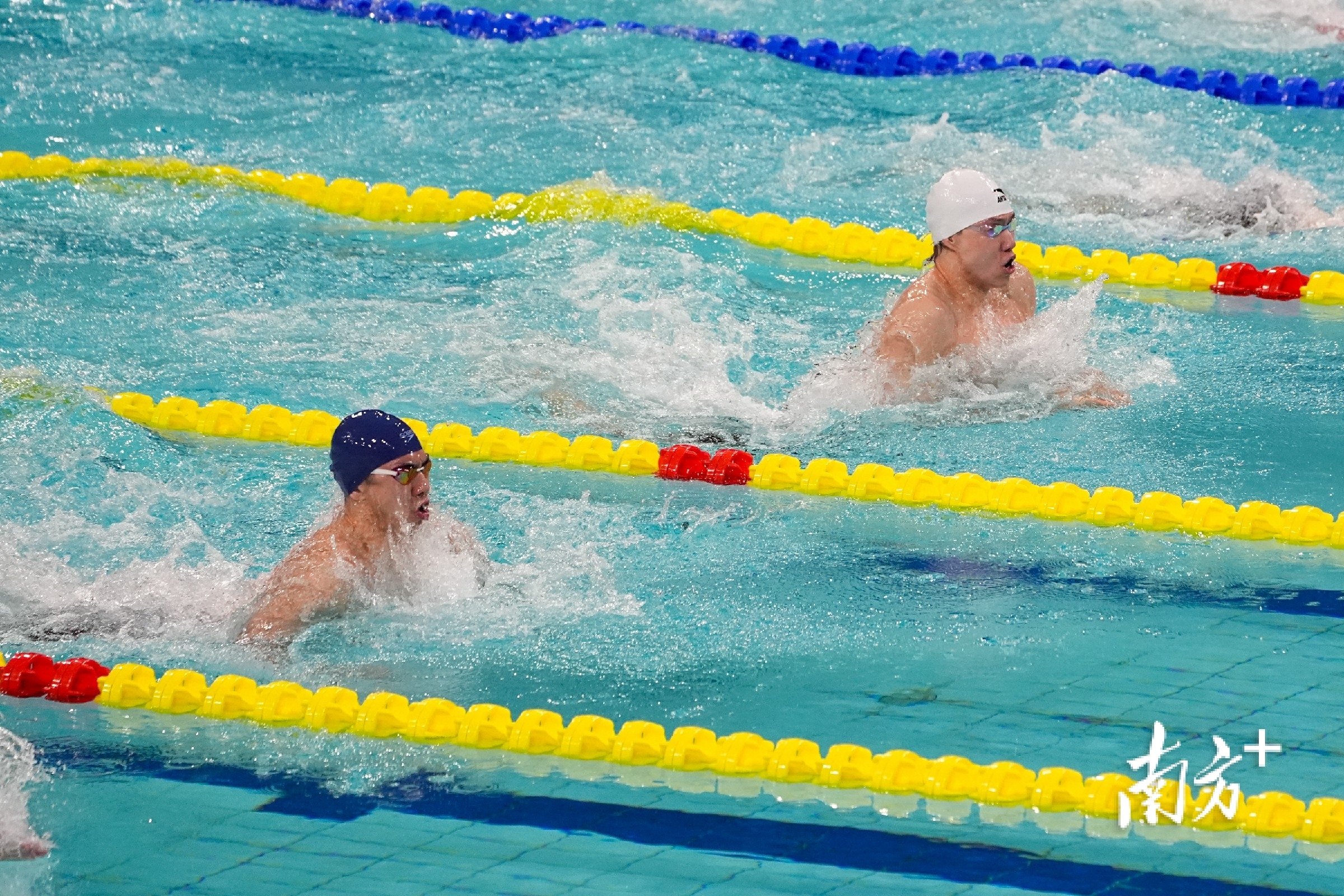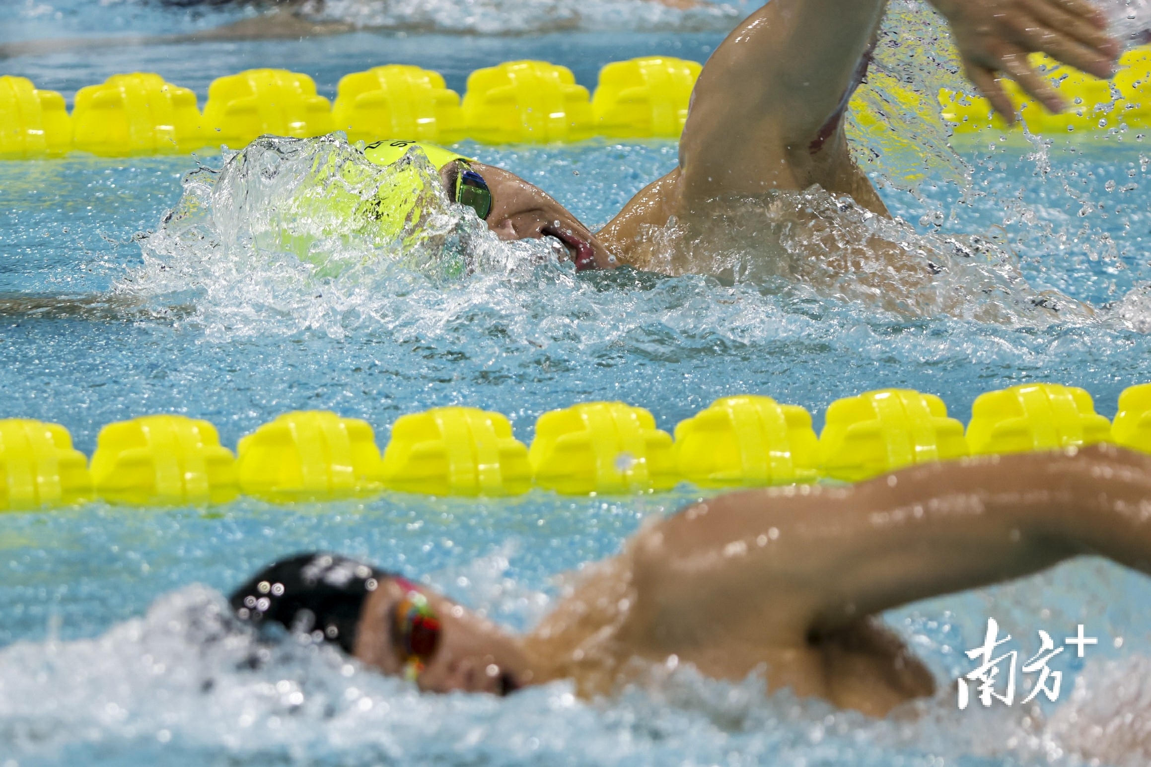 11月10日,十五运会游泳项目男子400米自由泳预赛,浙江队名将孙杨和潘展乐相邻赛道同场竞技,双双挺进决赛。朱洪波 摄