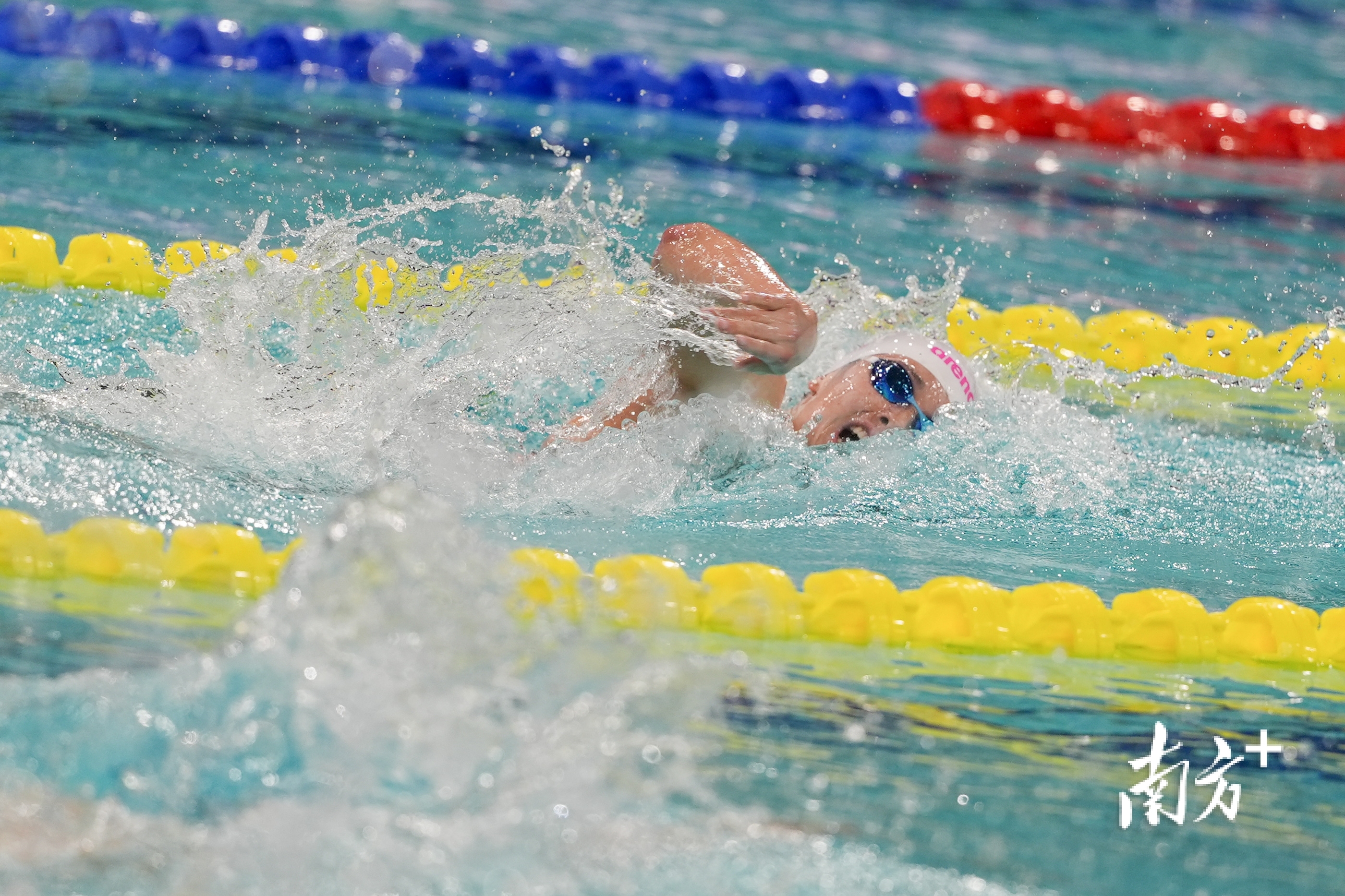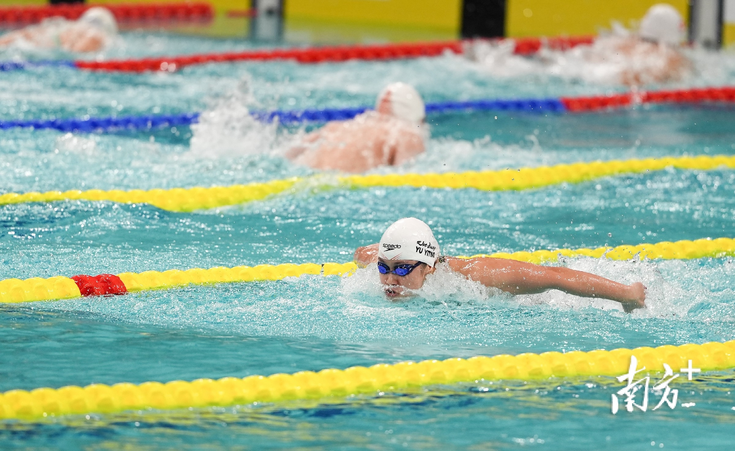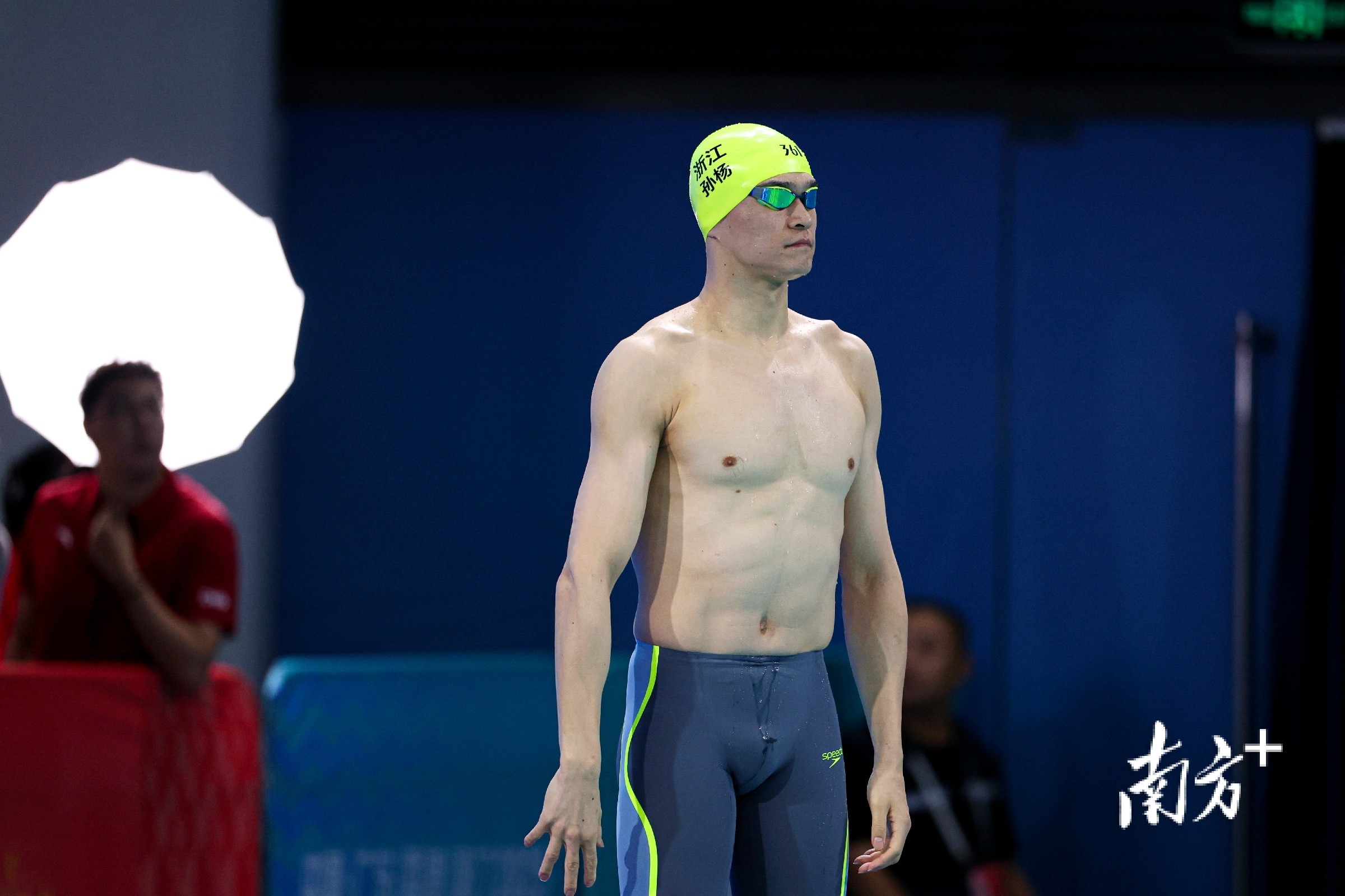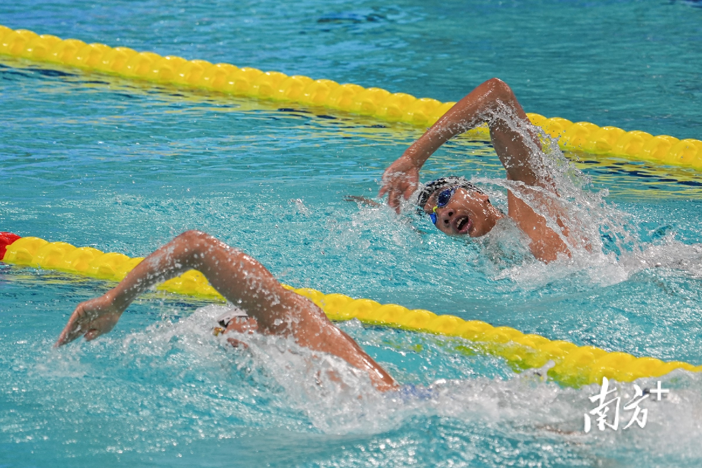 11月10日,十五运会游泳项目男子400米自由泳预赛,浙江队名将孙杨和潘展乐相邻赛道同场竞技,双双挺进决赛。朱洪波 摄
