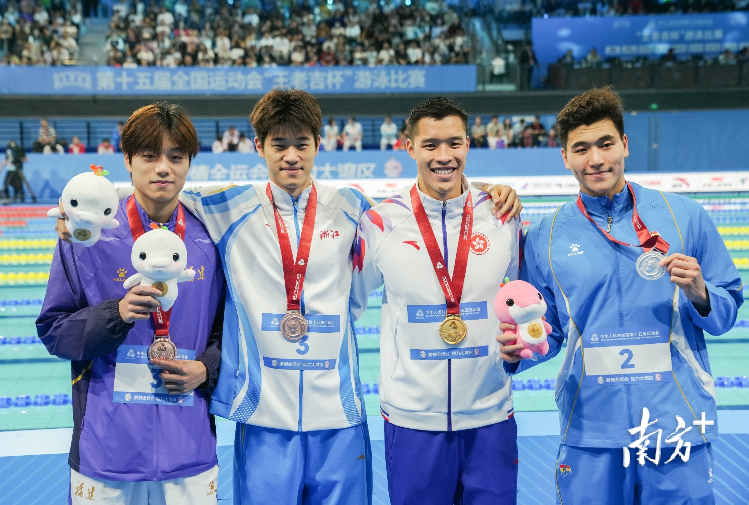 11月16日晚,男子50米自由泳决赛,香港选手何甄陶夺冠,陈昊获得银牌,潘展乐与刘吴狄并列第三,共同收获铜牌。他们走到记者面前,紧紧搂在一起,留下珍贵的合照。钟志辉 摄