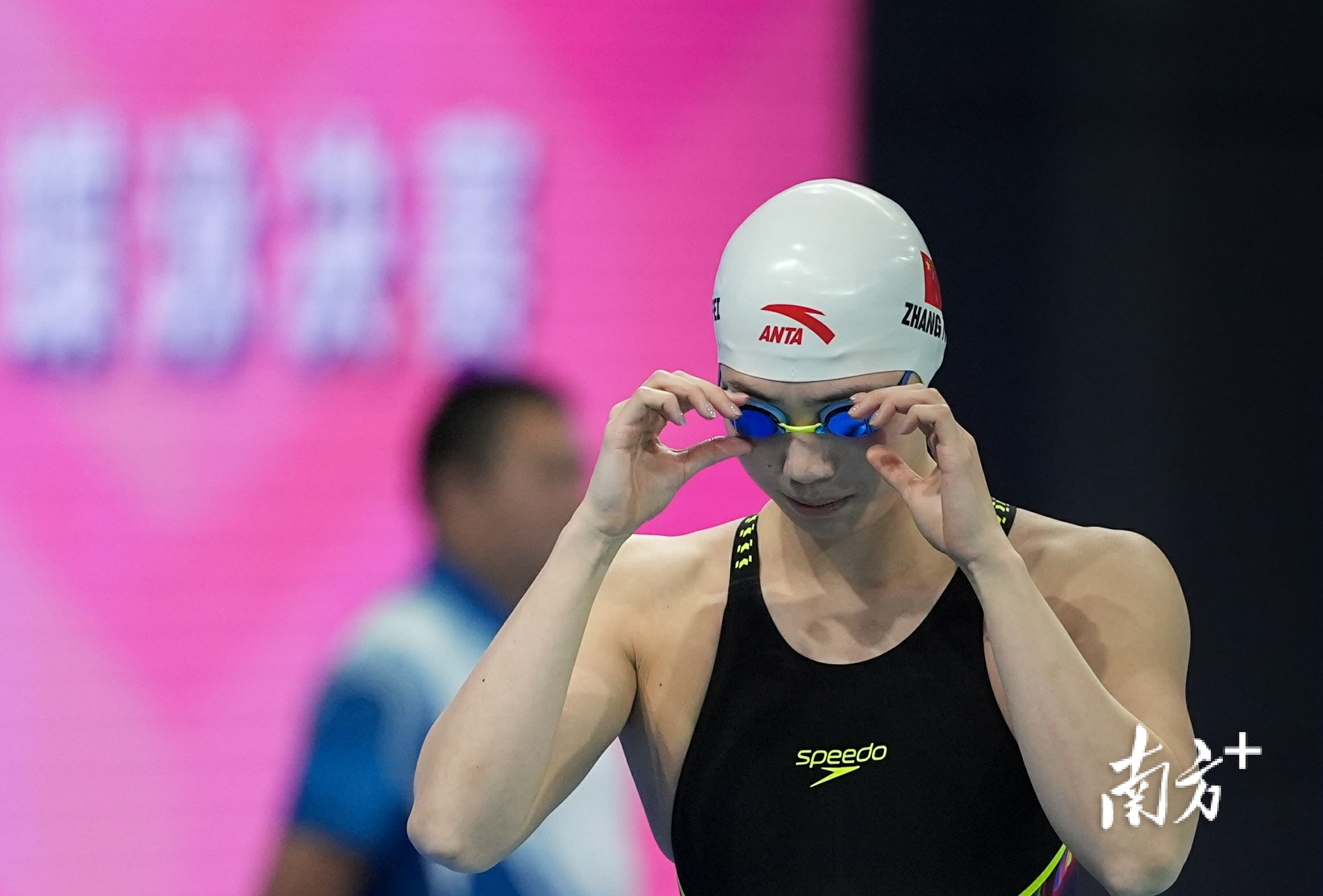 11月16日晚,在女子50米蝶泳决赛前,张雨霏调整泳镜位置,准备比赛。钟志辉 摄