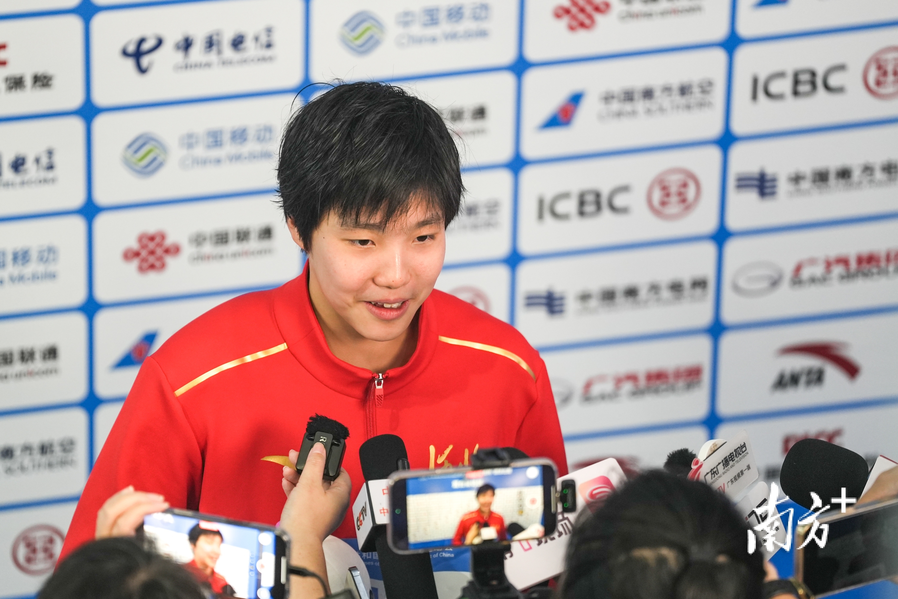 11月17日,在十五运会女子400米个人混合泳决赛中,于子迪摘得金牌,颁奖仪式后她接受采访。张令 摄
